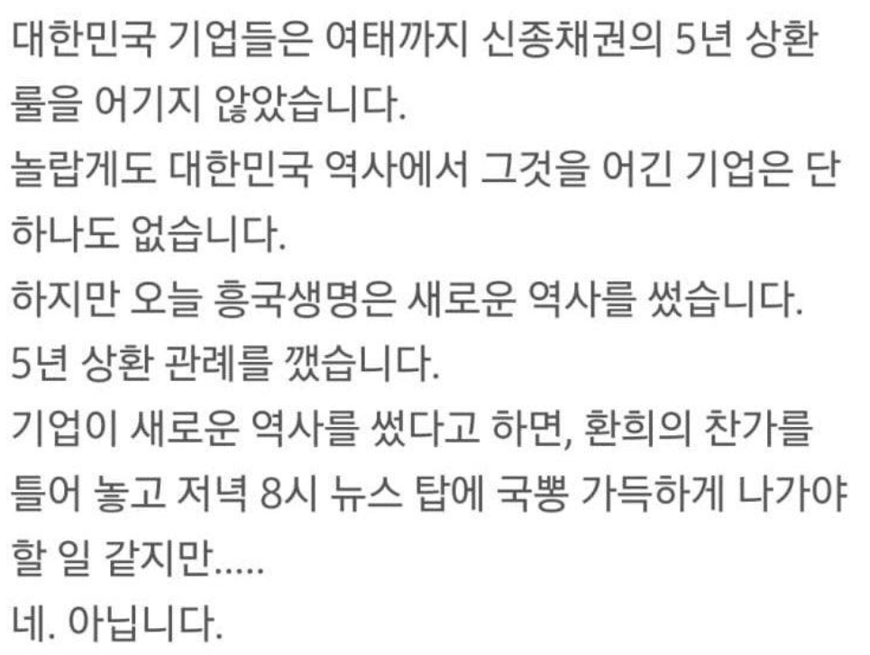 5. 하지만 흥국생명은 5년 상환 관례를 깨고 돈을 안갚았습니다.