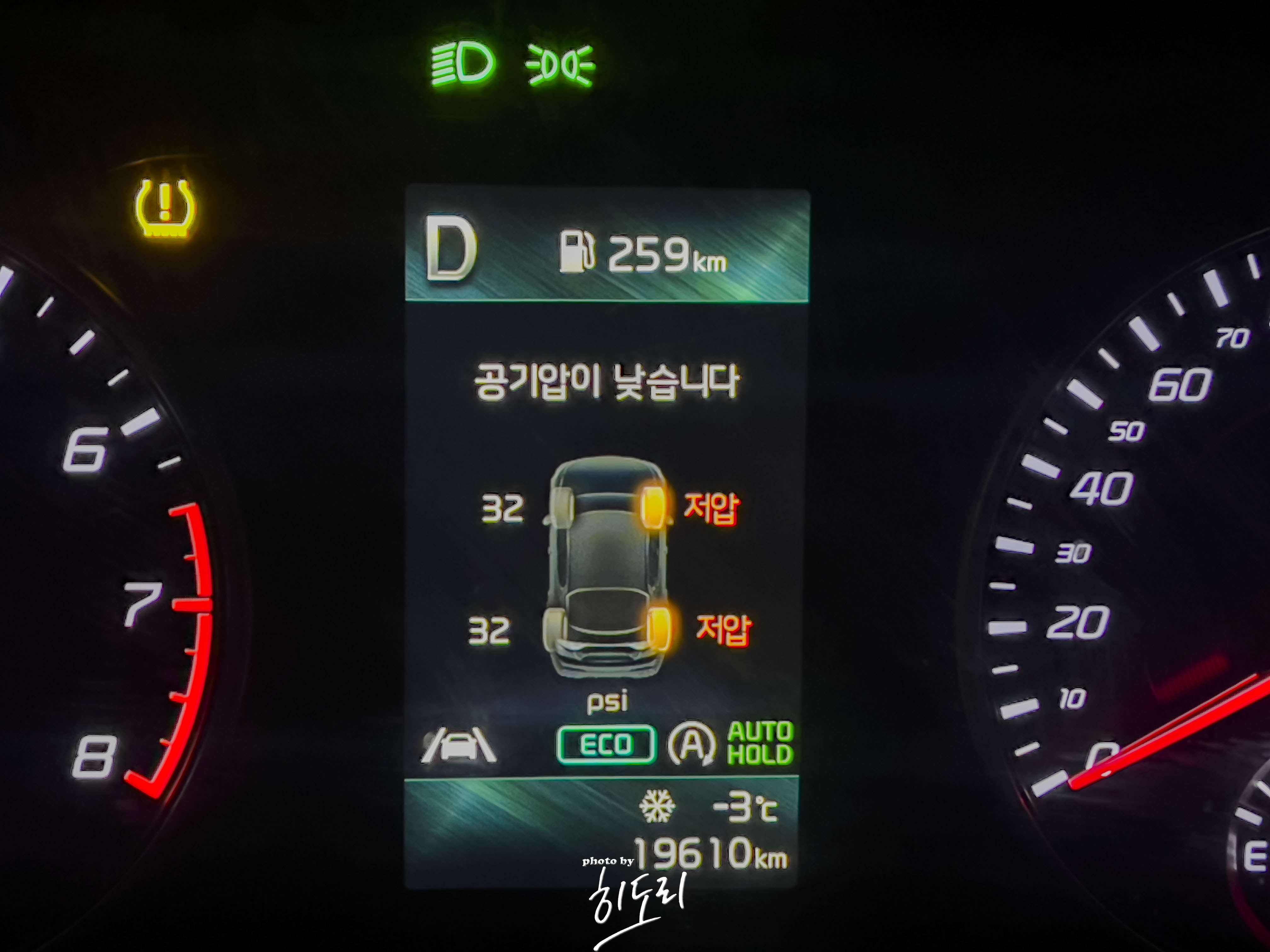 운행을 하다보면 사라지는 이유는 타이어 온도가 올라가면서 공기압이 돌아오기에 사라지게 되는겁니다.