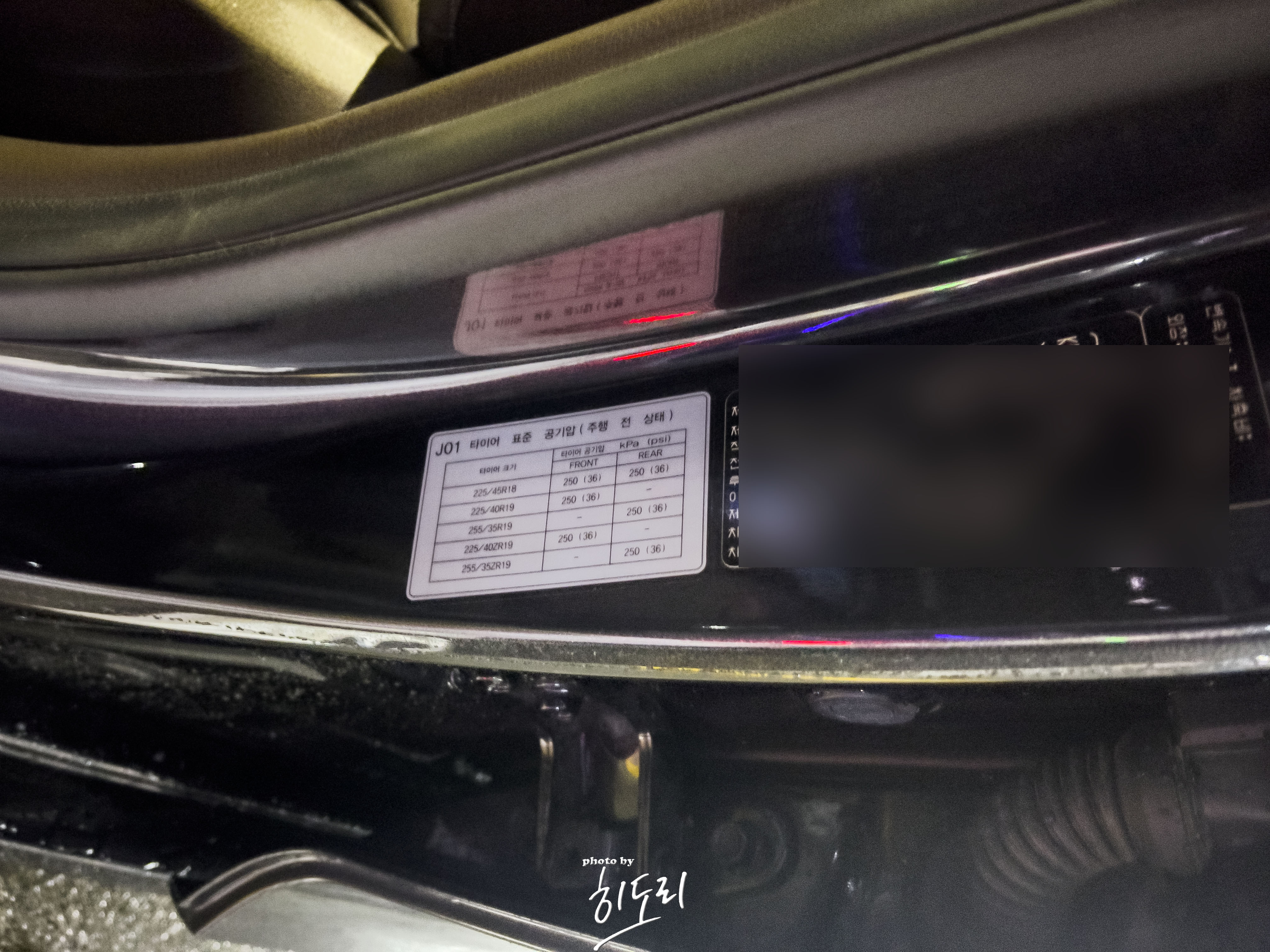 운전석 도어를 열고 하단 스티커를 보시면 표준 공기압이 적혀져 있습니다.