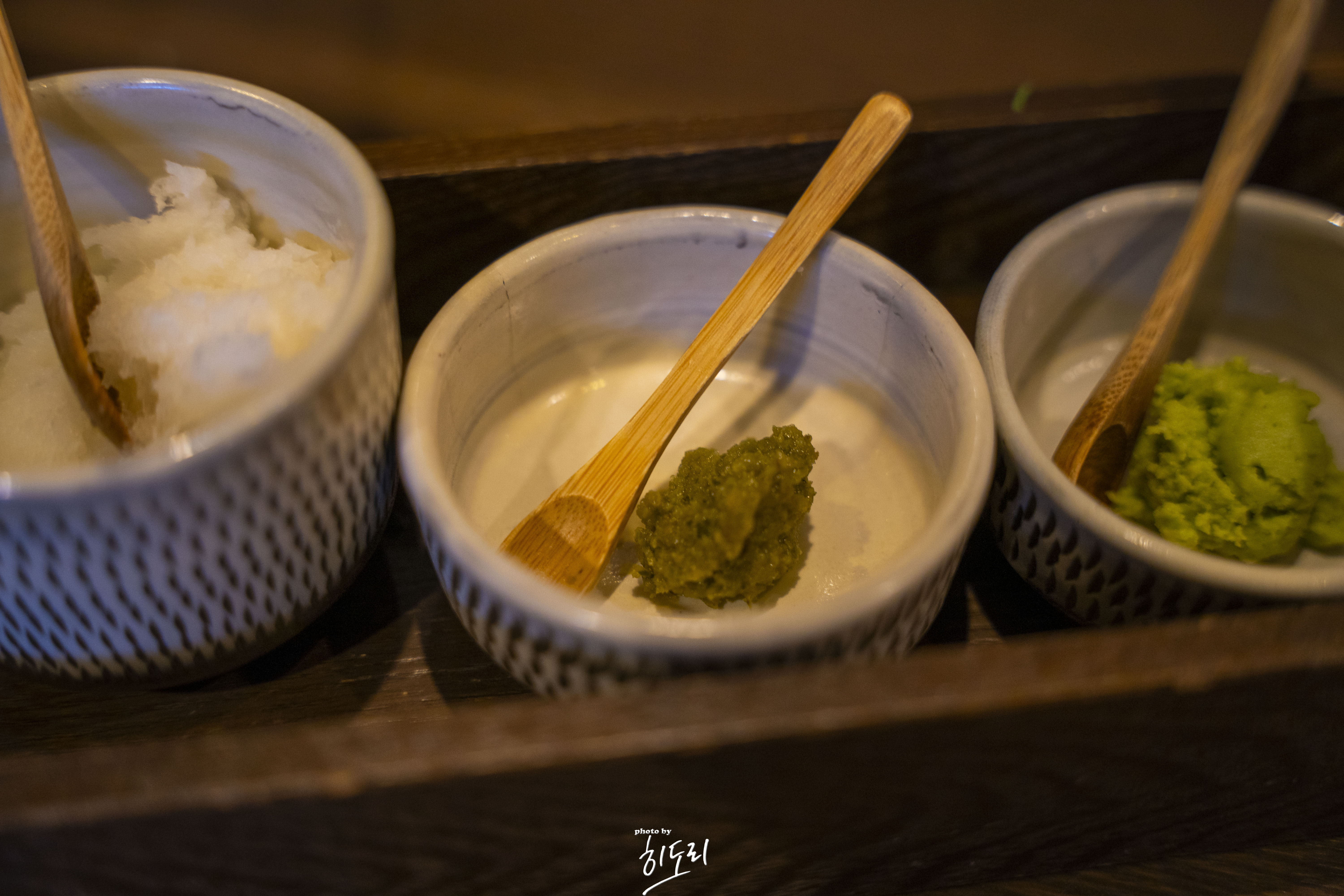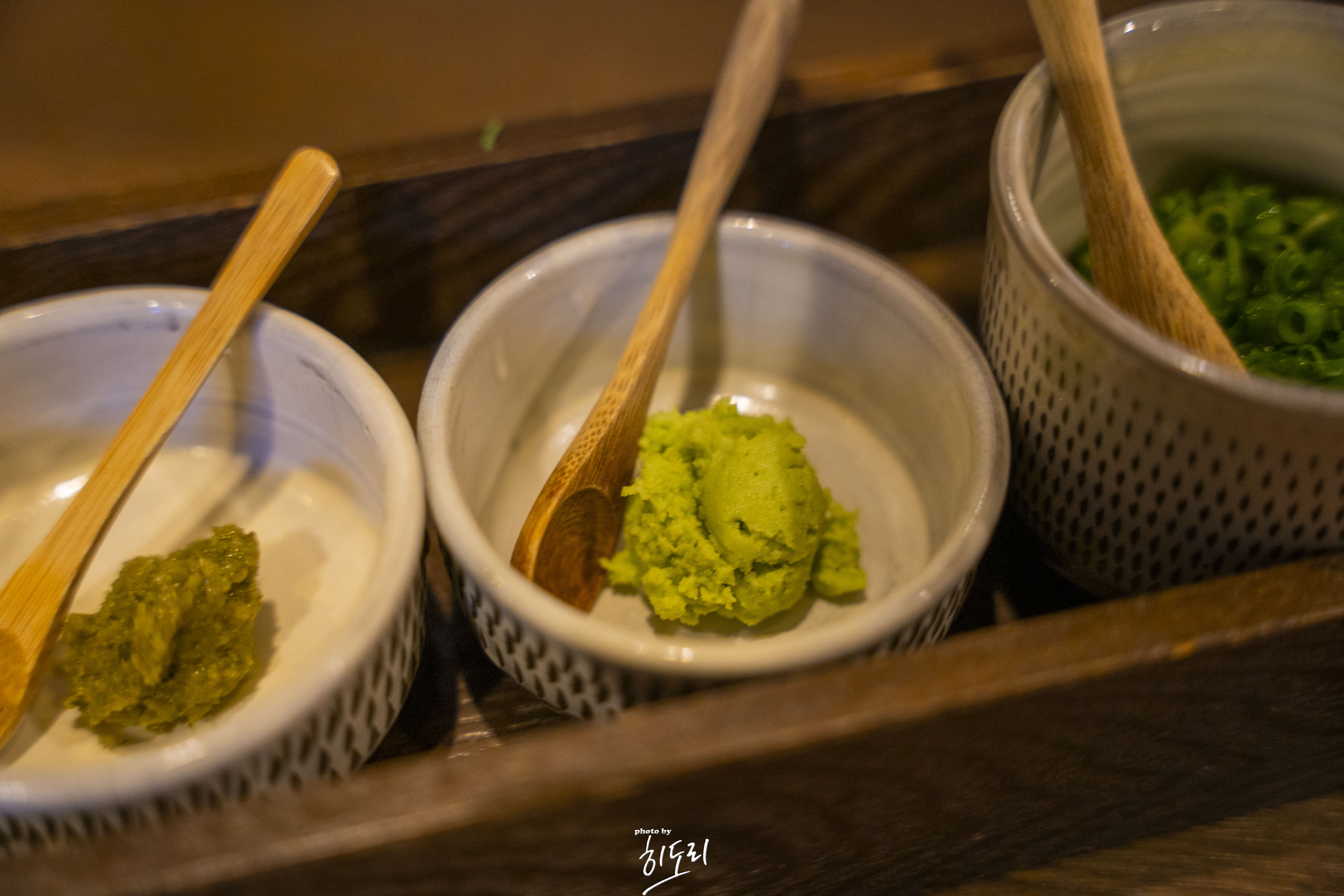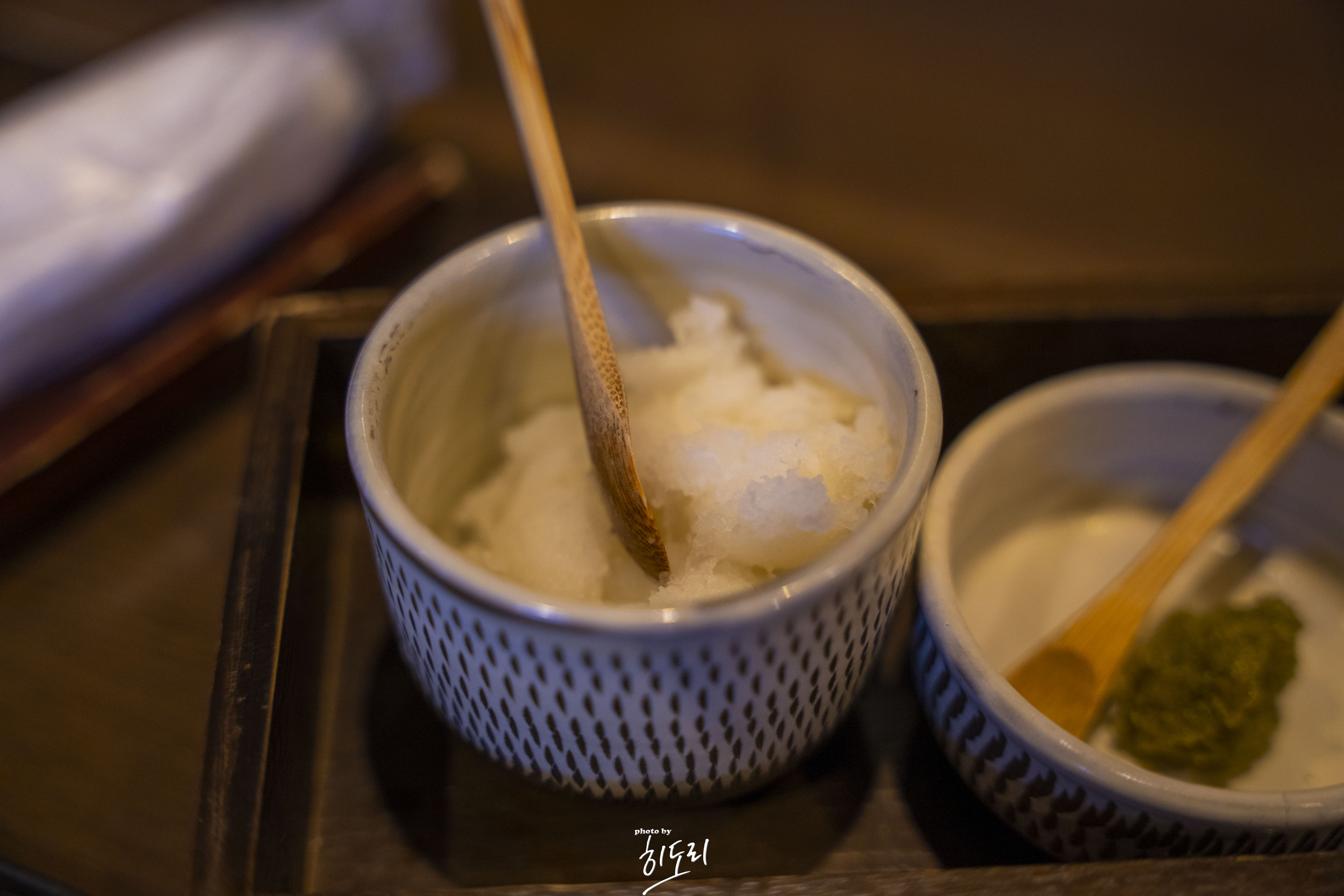 개인적으로 와사비와 간장소스를 넣고 육수를 살짝 넣어 촉촉하게 먹는 방법을 추천드립니다.