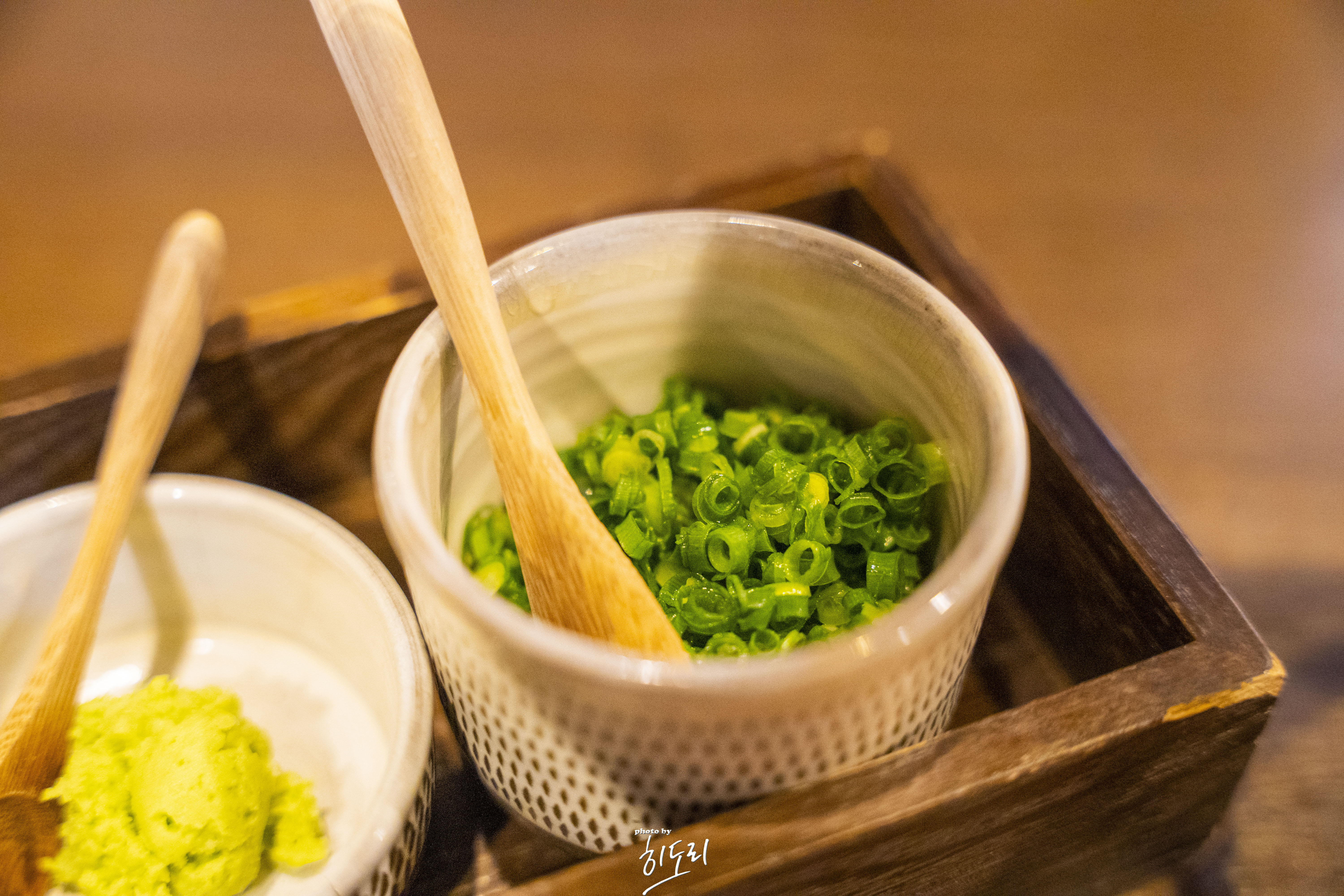 3. 와사비와 파를 넣고 육수를 살짝 부어 먹는다.