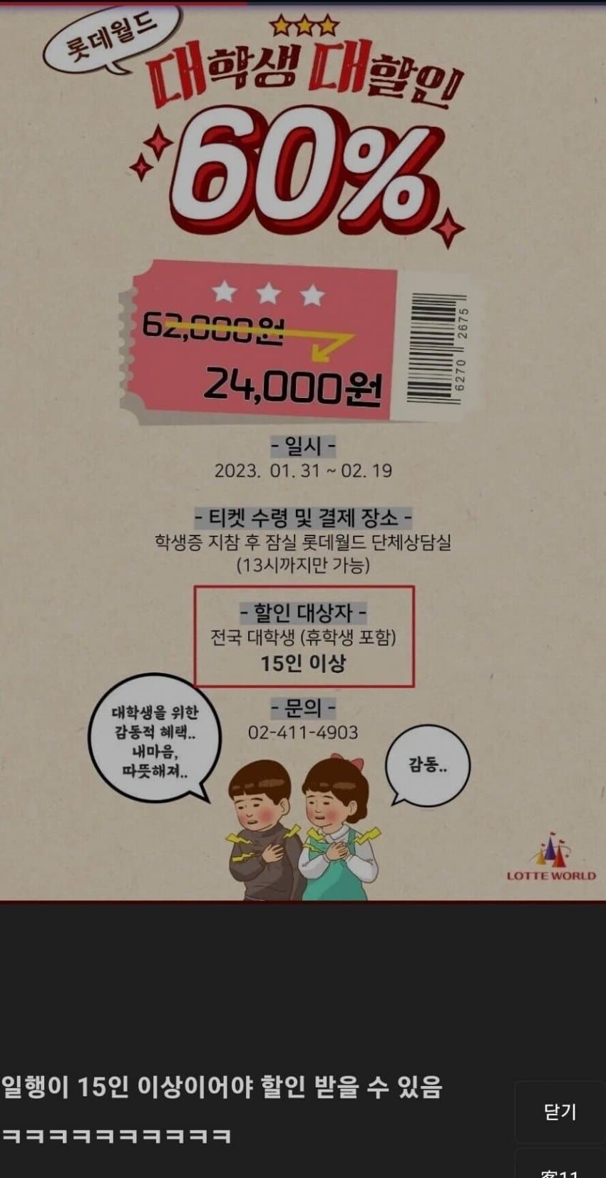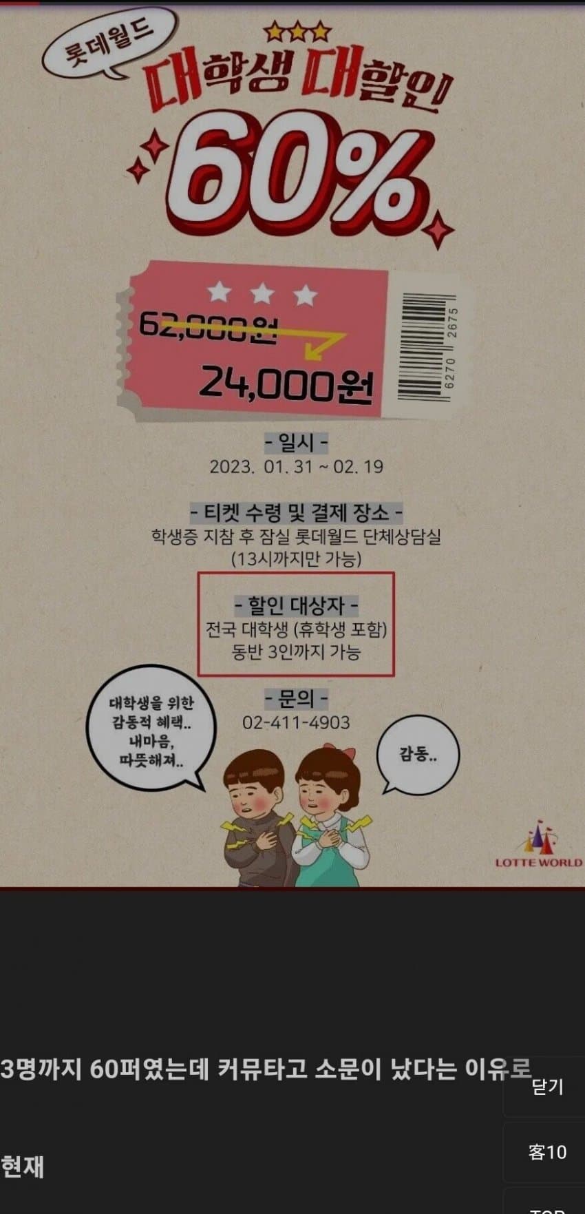 대학생 대할인 60% 3명까지 할인을 받아 24000원에 티켓을 판매한 롯데월드