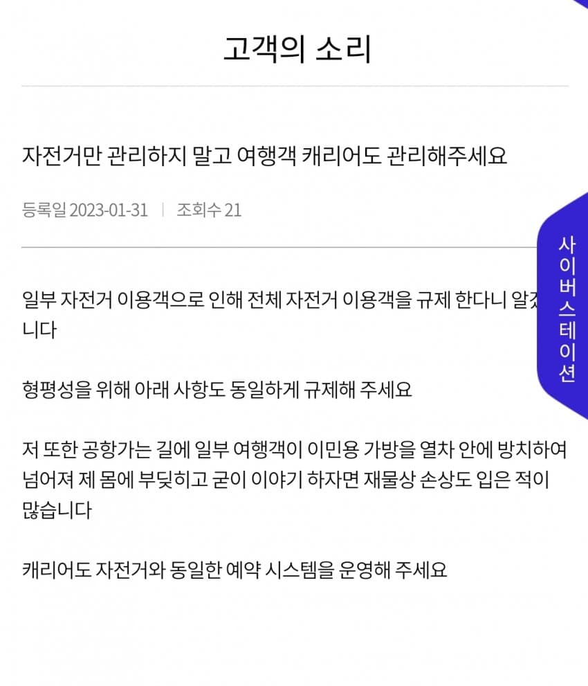 또 일부 민원인들은 자전거 전면 제한을 할꺼면 큰 캐리어도 규제하라고 작성하는 사람들도 있네요.