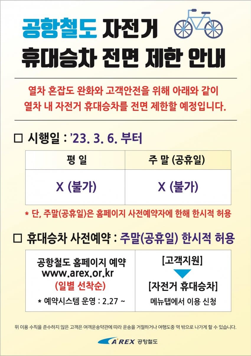 며칠전 서울역 - 인천공항을 운행하는 공항철도측은 3월 6일부터 자전거 승차 전면제한 정책을 발표했습니다.