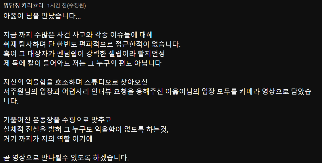 카라큘라는 편파적으로 인터뷰를 하지 않고 서주원의 입장과 아옳이의 입장 모두 영상에 담아 실체적 진실을 밝힌다고 합니다.