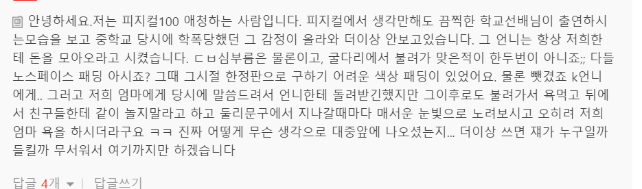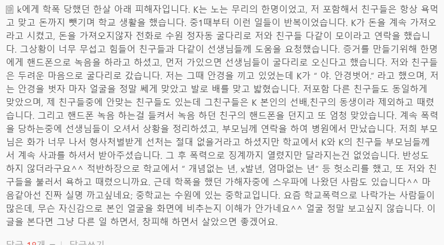 ":저는 기억하고 있는내용을 전부 거짓 보탬 없이 아주 상세하게 작성했고, 이름 또한 모두가 알고 계실만한 이유로 적을 수가 없습니다. 그럼에도 불구하고 글을 작성한 이유는 그 사람이 때린 사람은 저와 제친구 뿐만이 아니고 여러명이기 때문에 힘을 모아줄것"