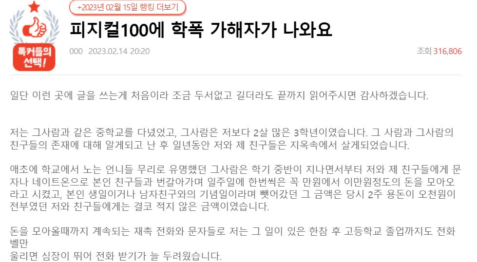 2. 가해자는 학교에서 일진! 일주일에 한번씩은 꼭 만원에서 이만원정도의 돈을 갈취