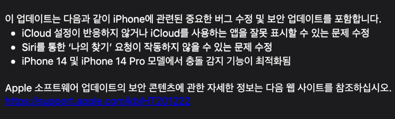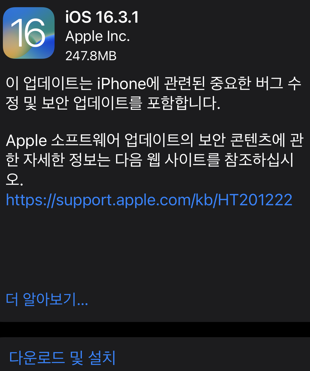 iOS 16.3.1는 버그 수정 및 보안업데이트가 중점인 마이너 업데이트 입니다.