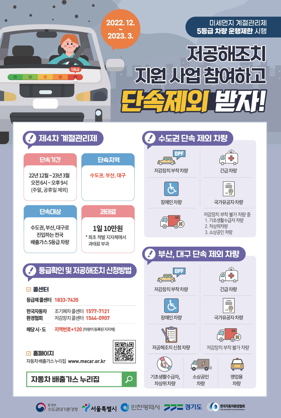 아무튼 올해부터는 수도권에만 한정됐던 배출가스 5등급 차량의 운행 제한이 부산·대구 지역에도 실행이 되며 이외에도 대전, 울산, 광주, 세종 등에서 운행 제한 시범 단속이 시작되며, 제5차 계절관리제부터는 의무화될 예정입니다.