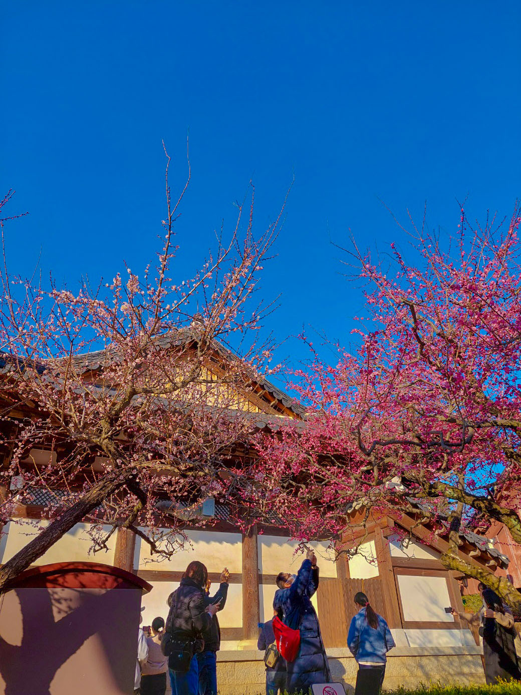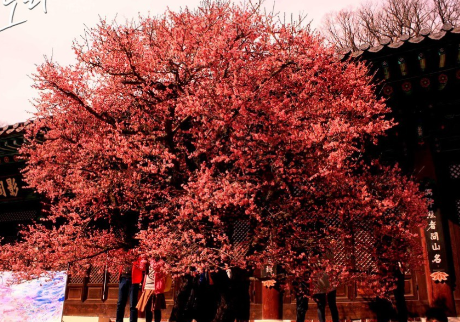 홍매화들은 아름다운 분홍색 꽃잎으로 가득한 가지를 들고 있으며 매화와 홍매화의 향기가 통도사의 정원을 가득 채우고 있습니다.
