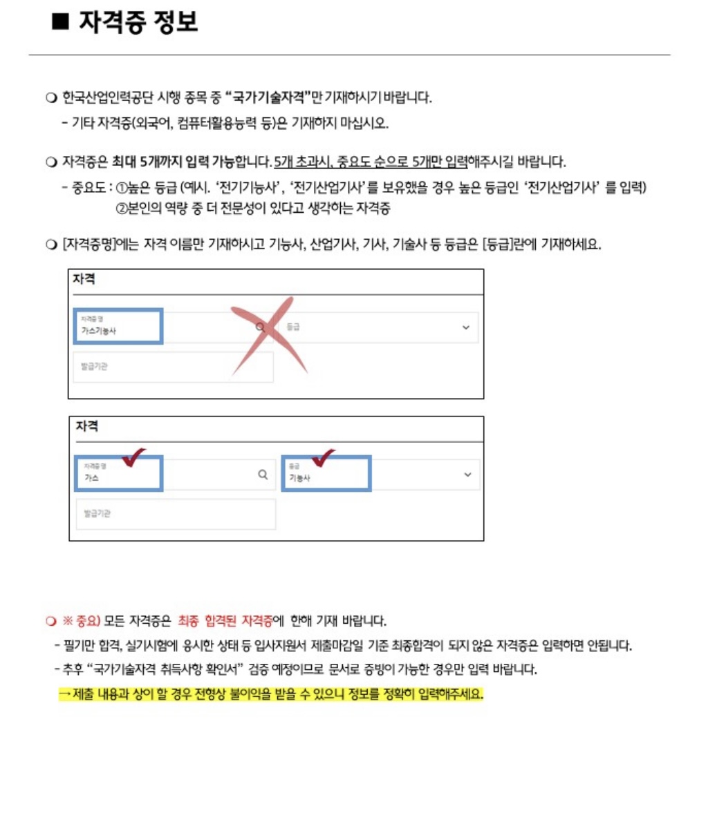 - 한국산업인력공단 시행 종목 중 국가기술자격만 기재하시기 바랍니다.