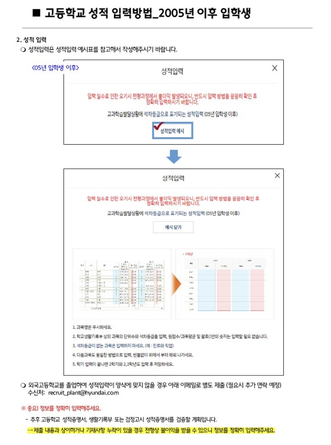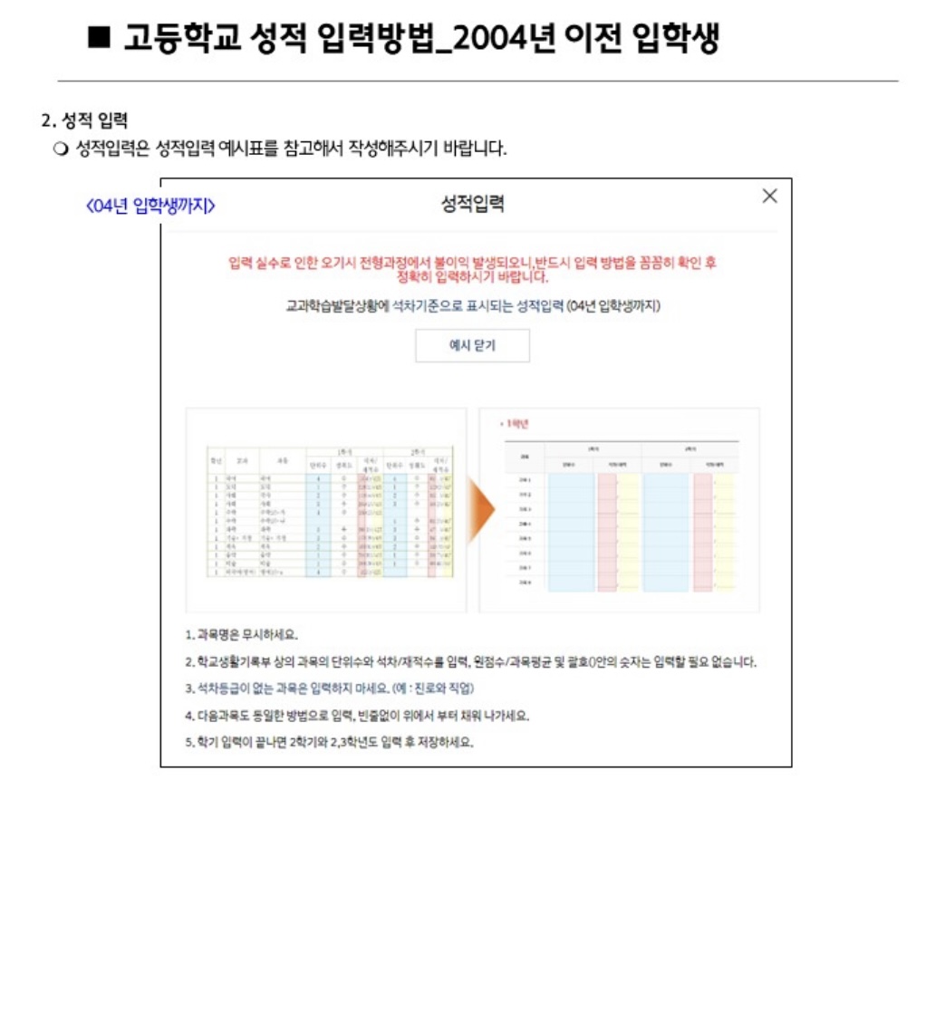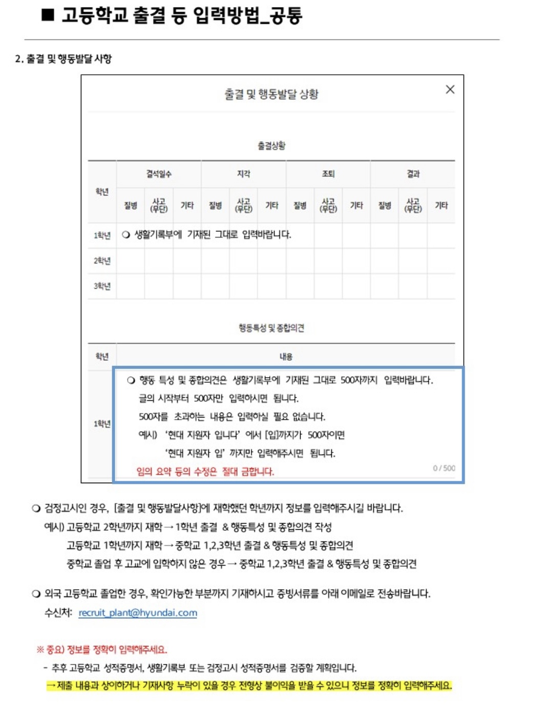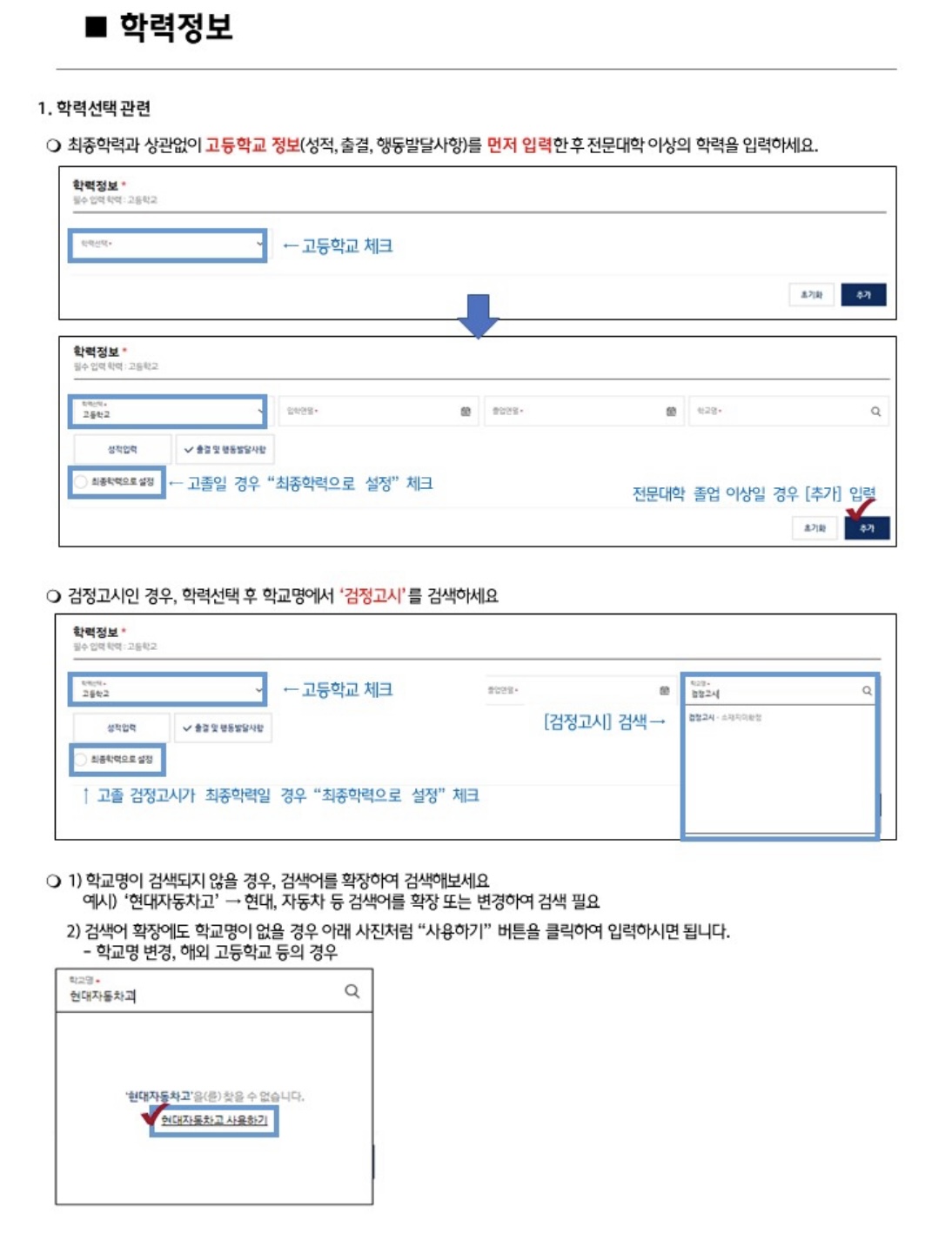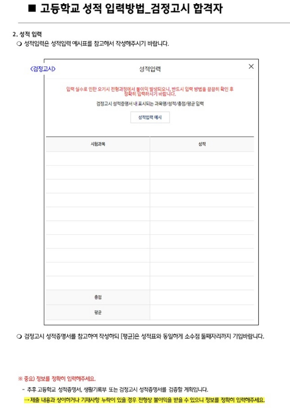 - 최종학력과 상관없이 고등학교 성적, 출결 및 행동발달사항은 필수로 입력하셔야 합니다.