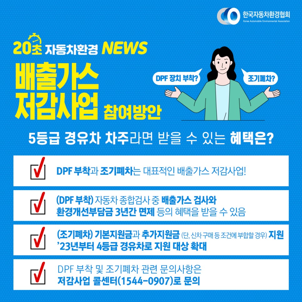 5등급 경유차 소유자는 배출가스 저감사업을 통해 다음과 같은 혜택을 받을 수 있습니다.
