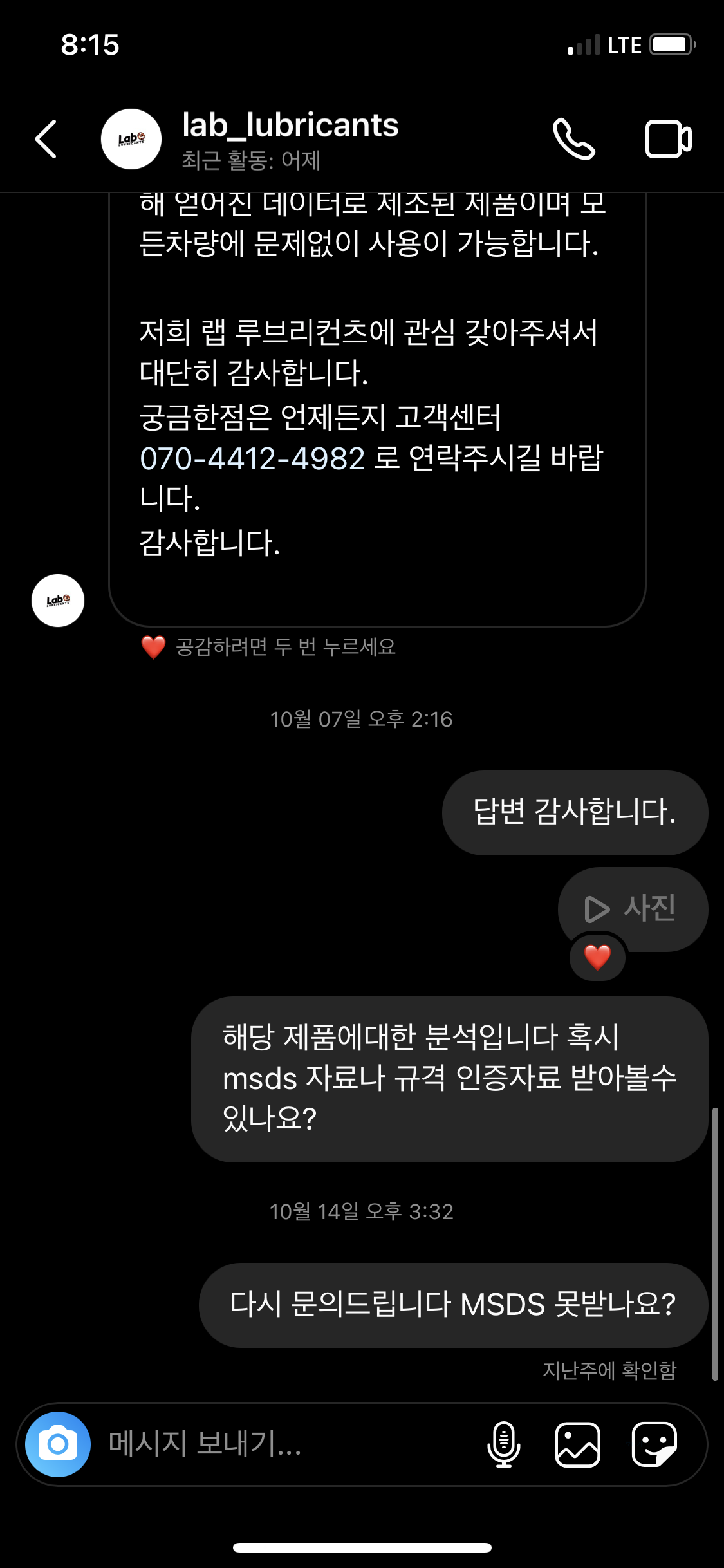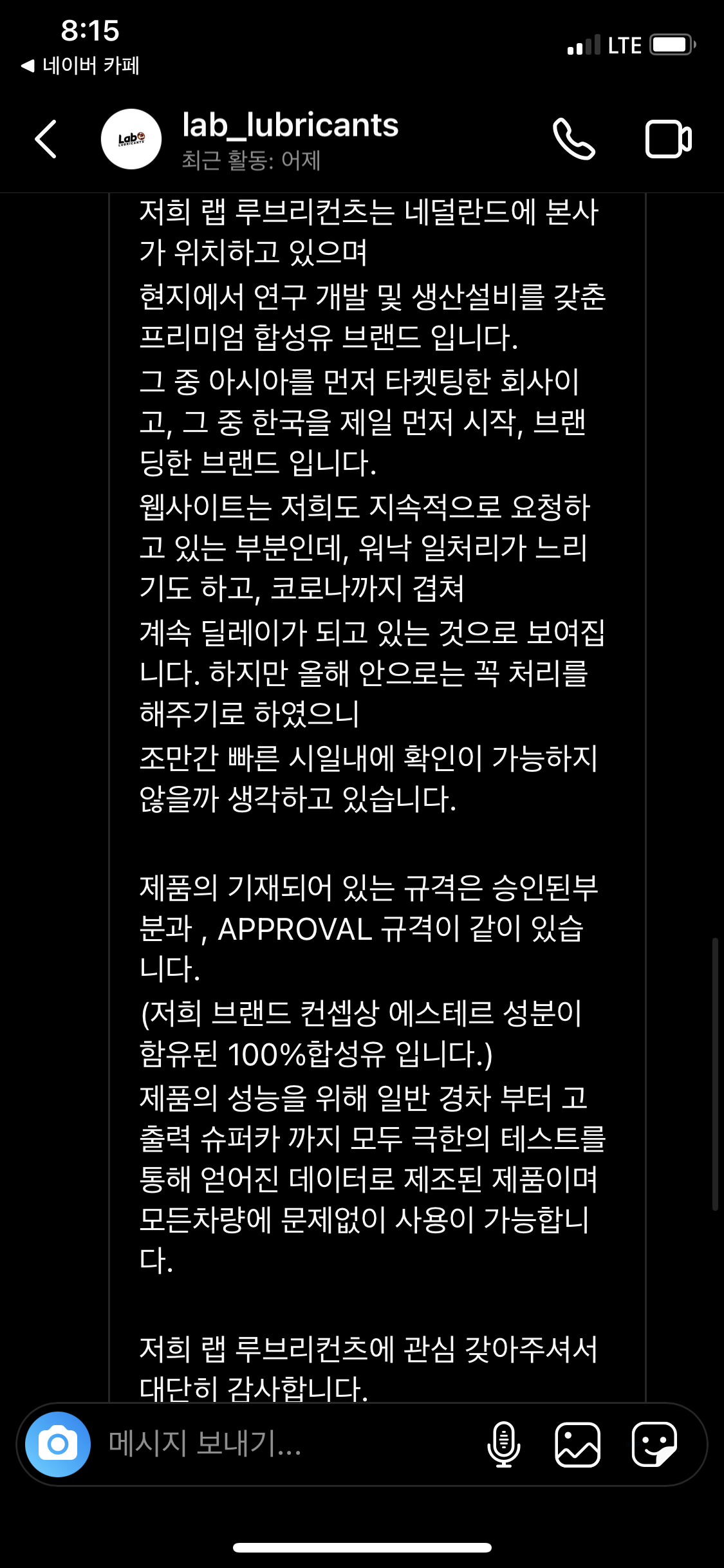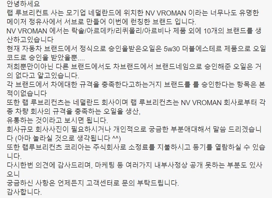 랩 엔진오일에 문의를 했을때의 답변입니다.