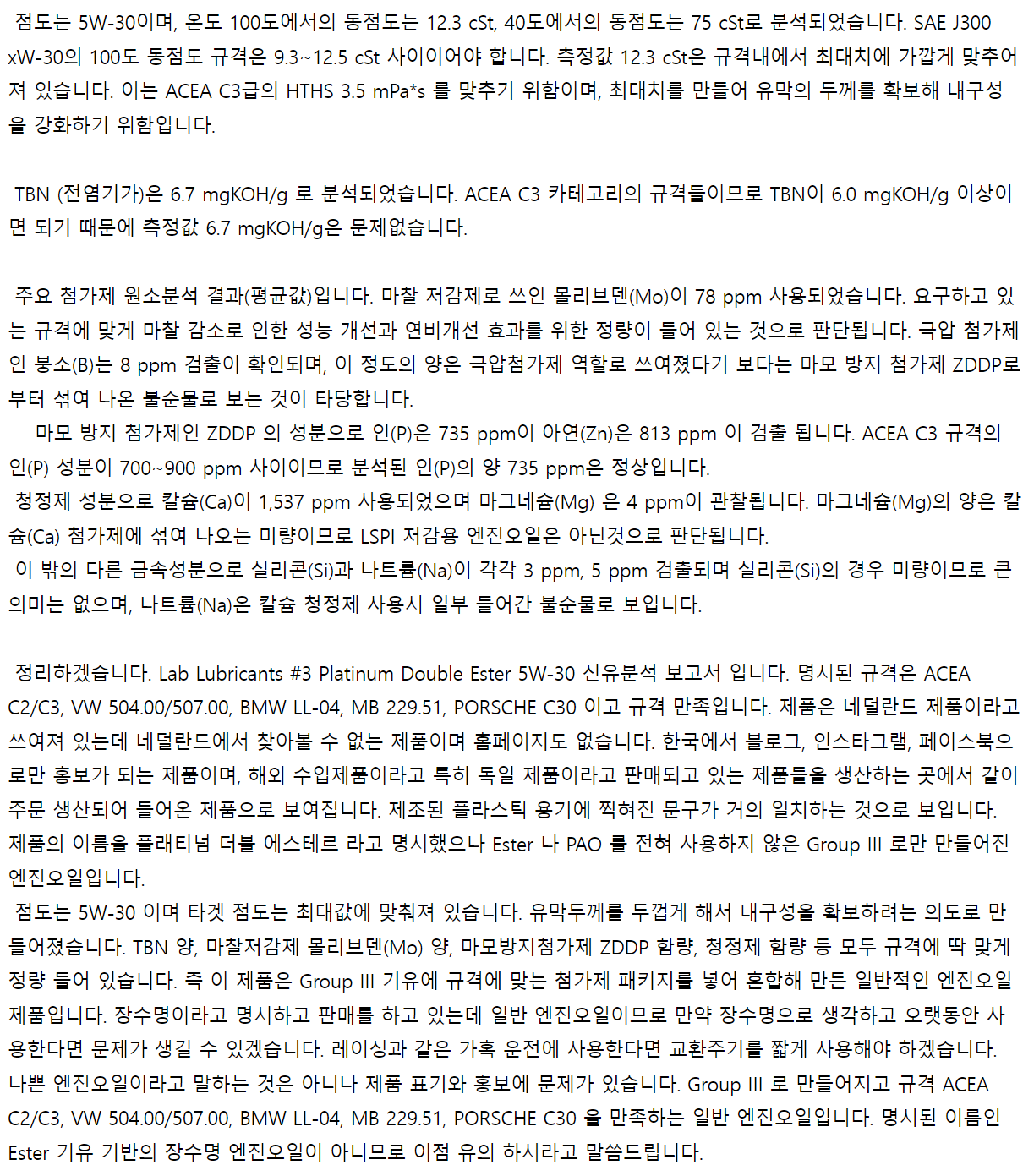 네이버카페 '엔진오일의 불편한 진실' 에서 해당 랩 엔진오일을 분석을 한 결과물이 나왔는데 깜짝 놀랐습니다.