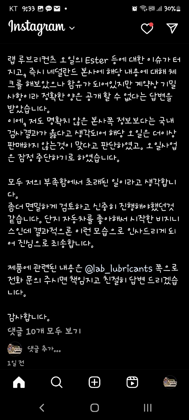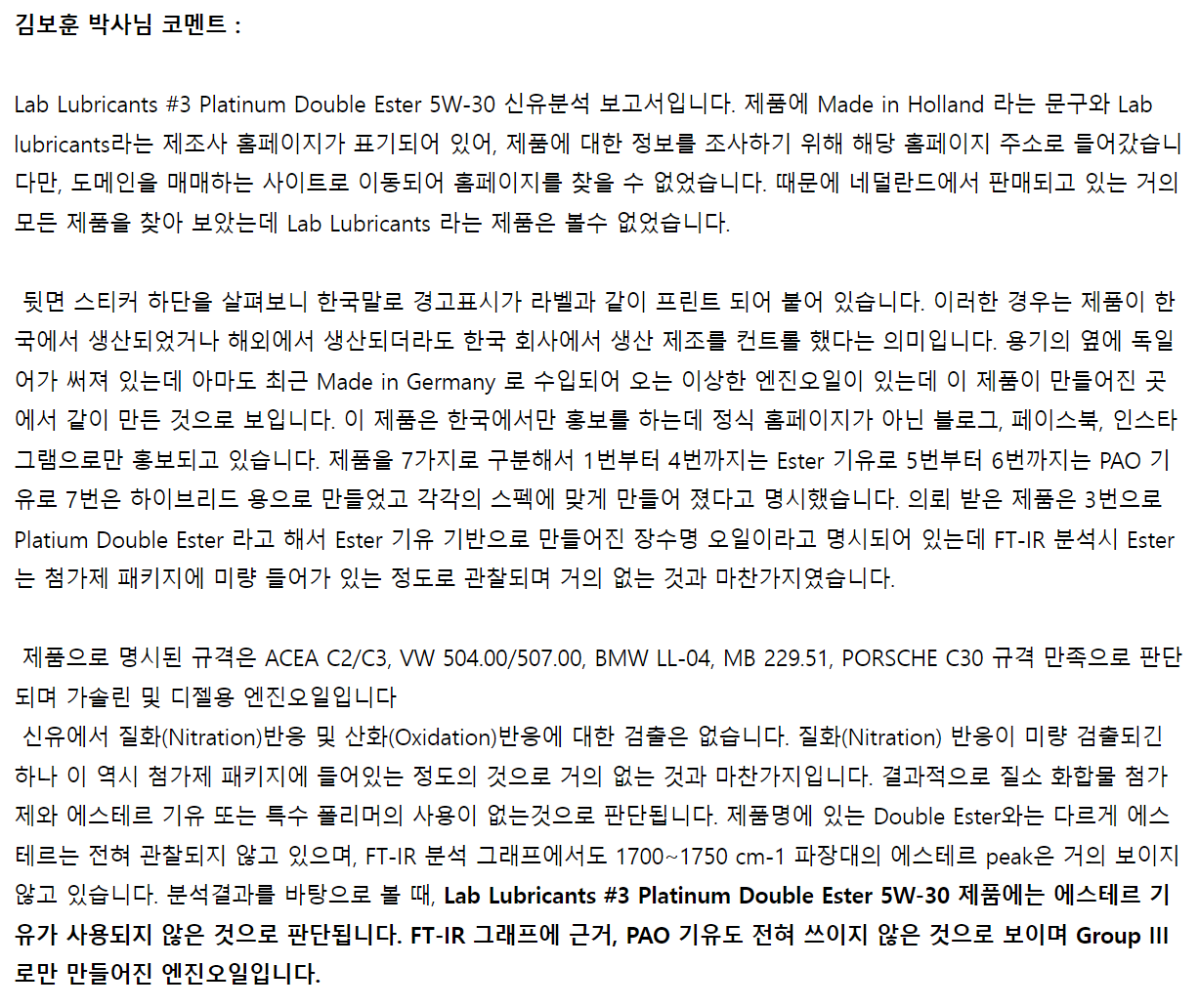 그런데! 이번 분석이 나오기전 랩엔진오일이 런칭했을때 랩 엔진오일에 의문점을 가진 사람이 있었습니다.