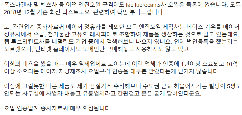 해당 엔진오일은 폭스바겐, 벤츠등 어떤 엔진오일 규격에도 랩 루브리컨트 오일은 없다고 지적을 했습니다.