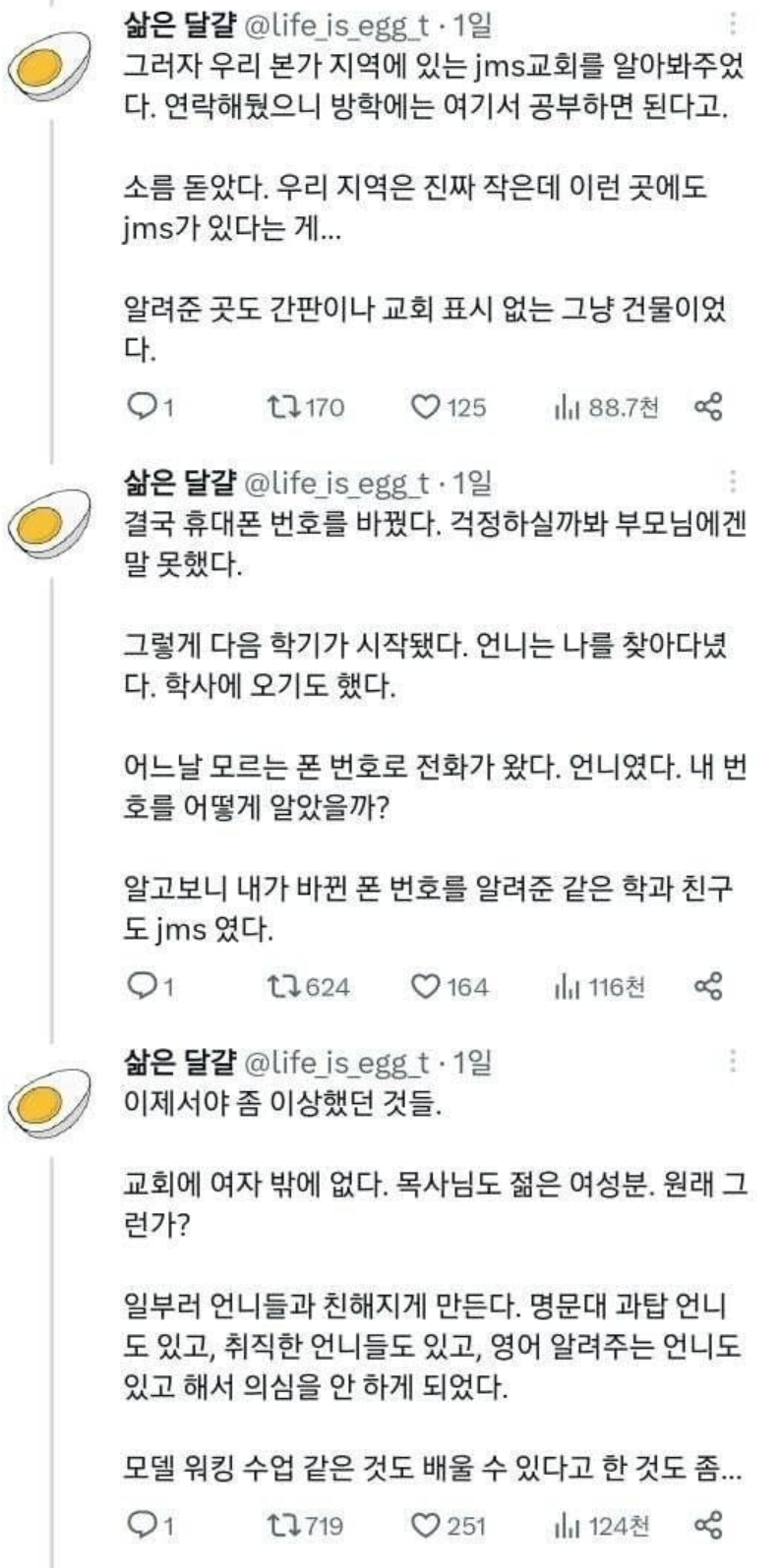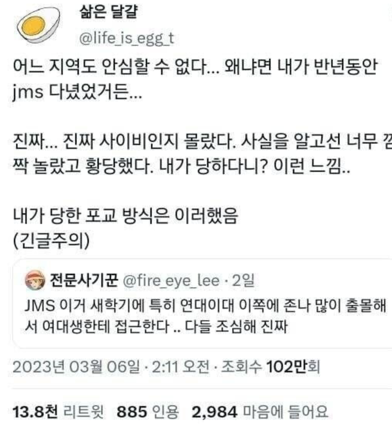 아래는 한 여대생의 JMS 체험기를 트위터에 올린 글 입니다. 한번 읽어보세요.
