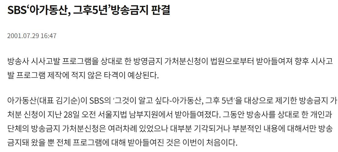 2001년 그알에서 아가동산을 방영을 했었는데 이때도 방송금지 판결이 일어났고