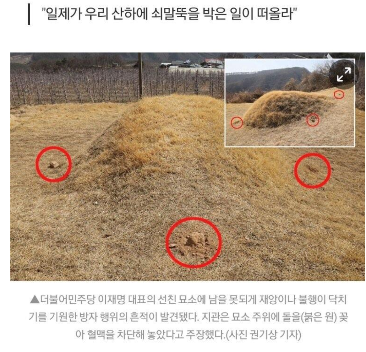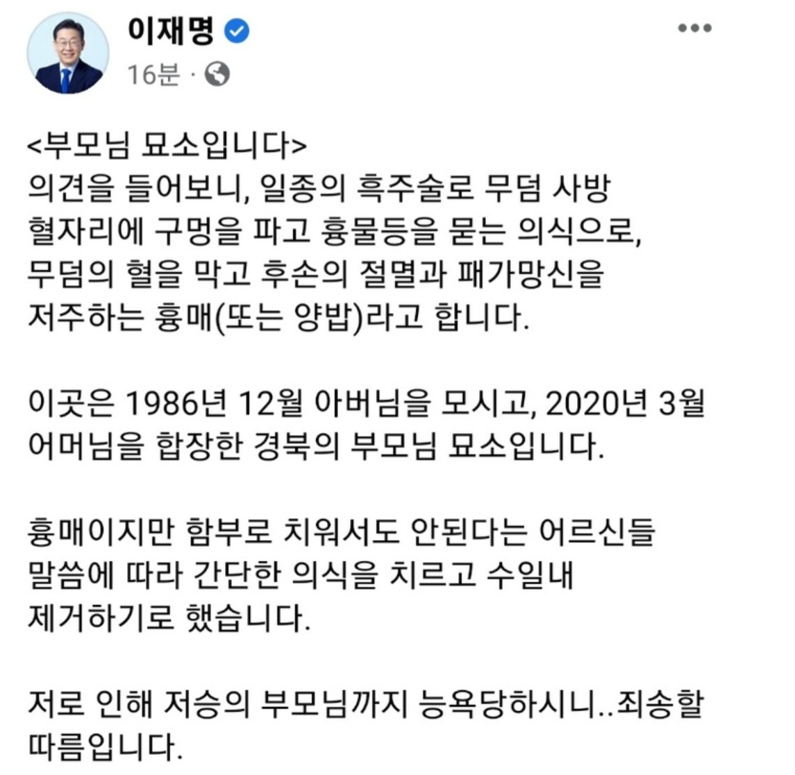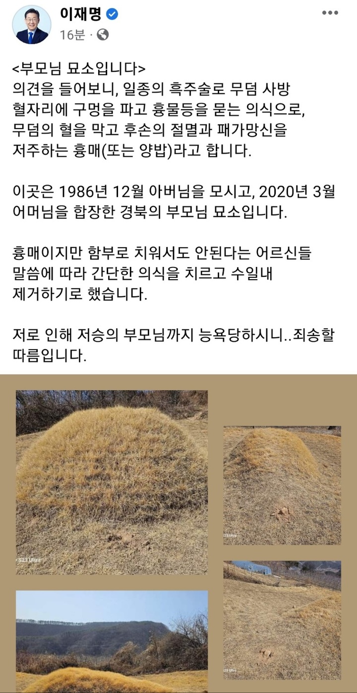 이재명 대표는는 "흉매이지만 함부로 치워서도 안 된다는 어르신들 말씀에 따라 간단한 의식을 치르고 수일 내 제거하기로 했다", "저로 인해 저승의 부모님까지 능욕당하시니 죄송할 따름"이라고 했습니다.