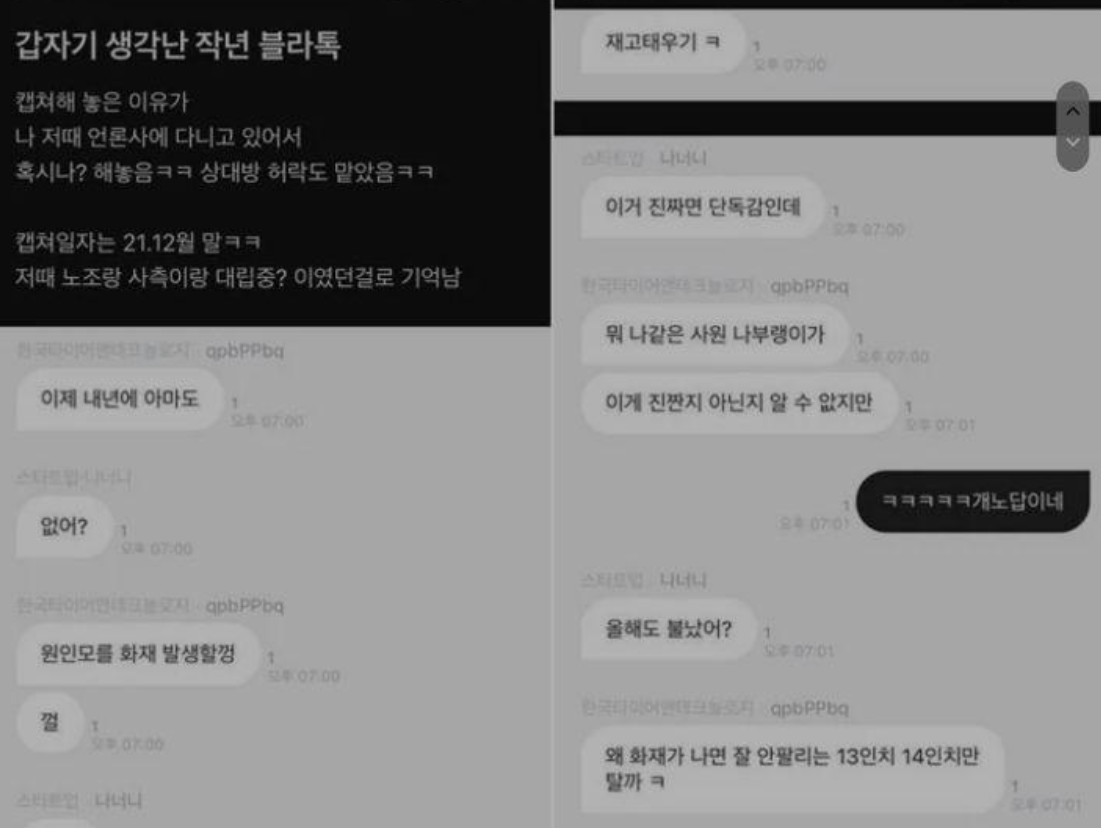이 글은 2021년 12월에 올라왔던 글 입니다. 한국타이어 화재 사건과 관련하여 한국타이어의 사원들이 원인 모를 화재 발생을 미리 예언했다는 대화 내용이 공개되었습니다.