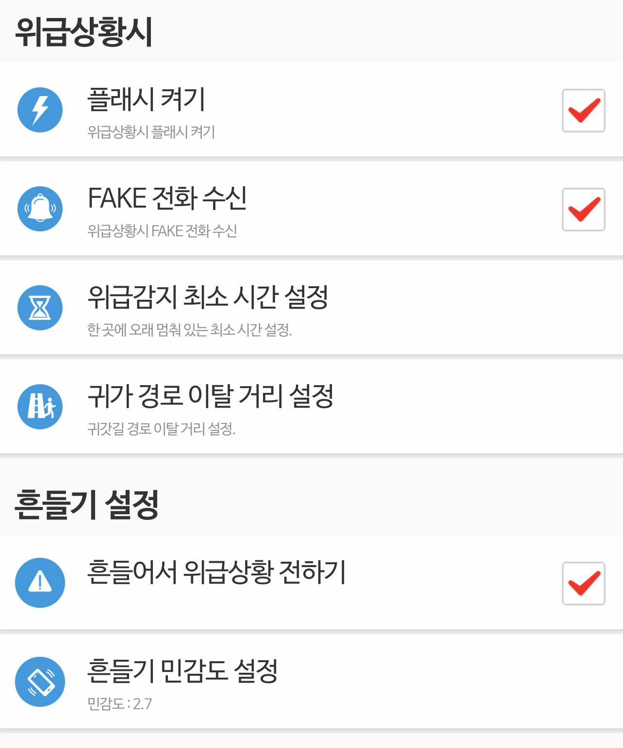 셋째, 설정에서 위급시 스마트폰을 흔들어 울산 남구의 관제센터로 바로 연결을 하여 위험한 상황을 대처 할수가 있습니다.