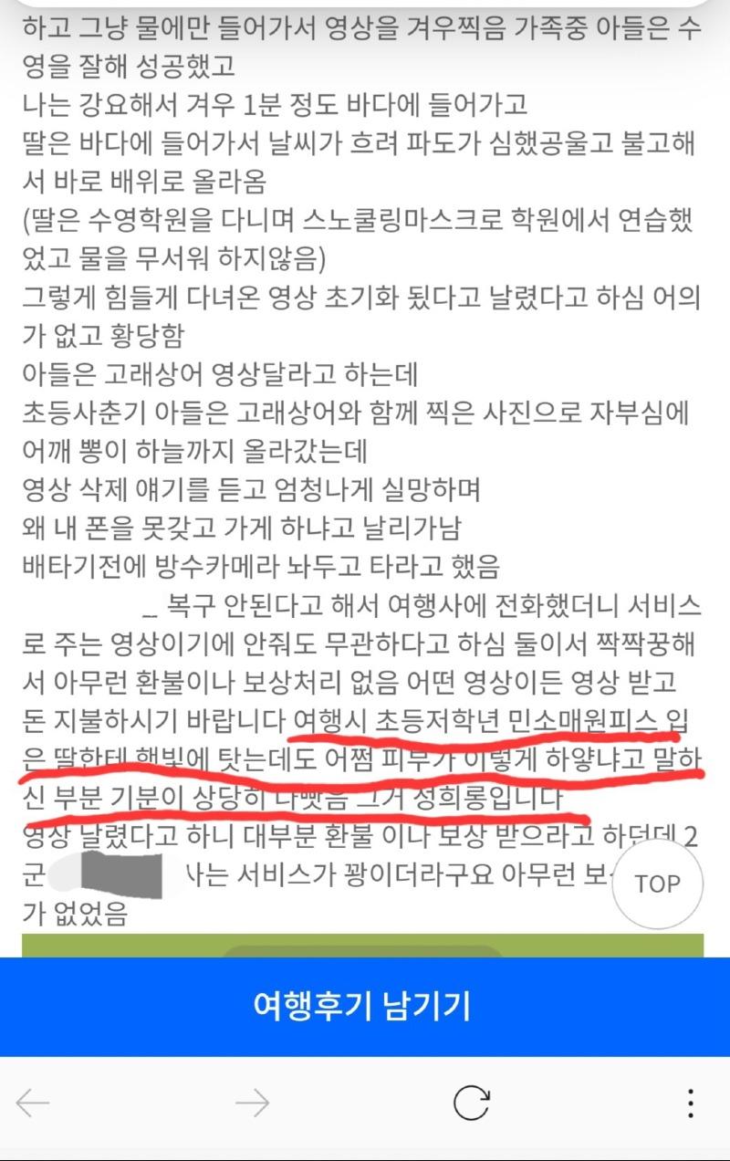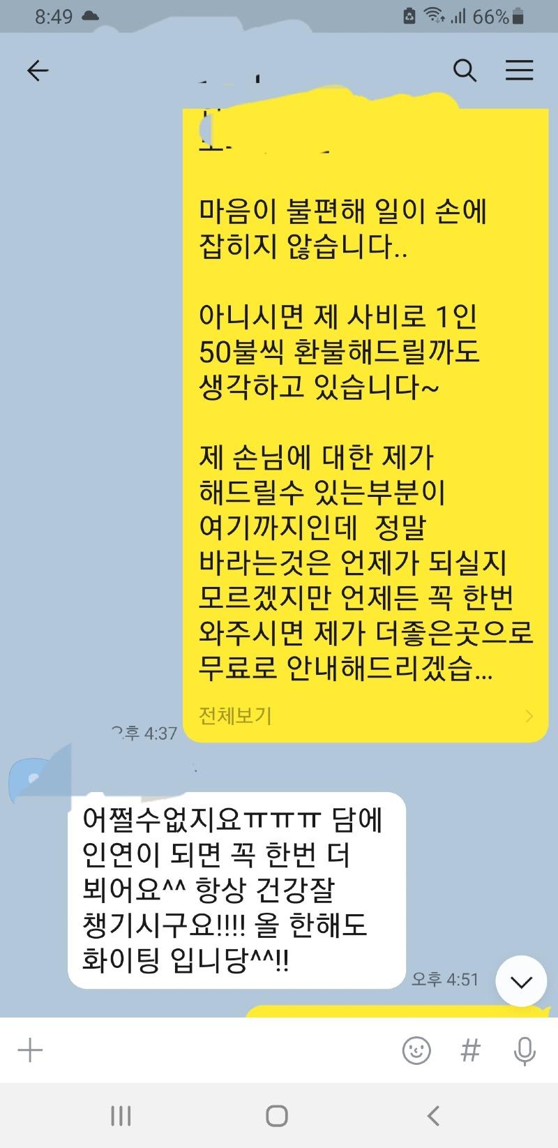 사람이 하는 일이라 실수가 있을 때가 있지만 그러한 경우 해결 방안에 따라 진정성 있는 사과와 적절한 보상이 중요하다고 남편도 잘 알고 있습니다. 남편은 그날 투어 비용의 4분의 1 상당액을 환불하고자 제안했습니다. 파일이 날라간 고객분들께 같은 내용으로 진심어린 사과의 말씀과 함께 환불 제안 드리고 있습니다. 넘어가시는 분도 계시지만 환불 받으시는 분들도 계십니다. 남편의 실수로 인한 불편과 손해를 드리고 이 일로 인한 신뢰 저하를 어떻게든 만회하고자 최선을 다하고 있습니다.