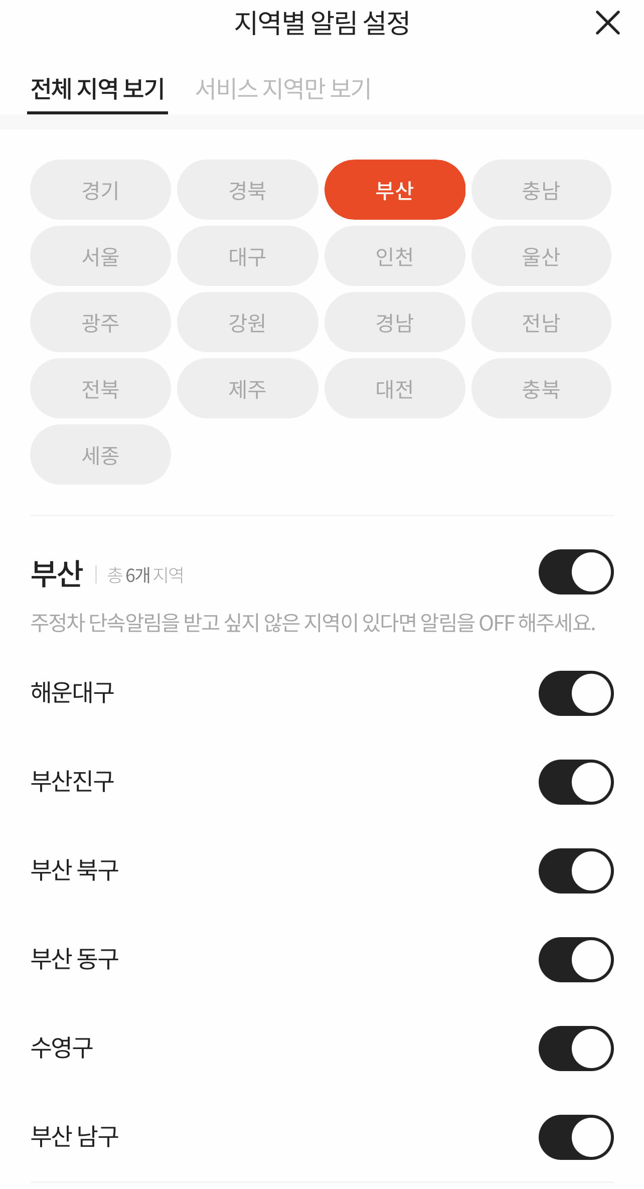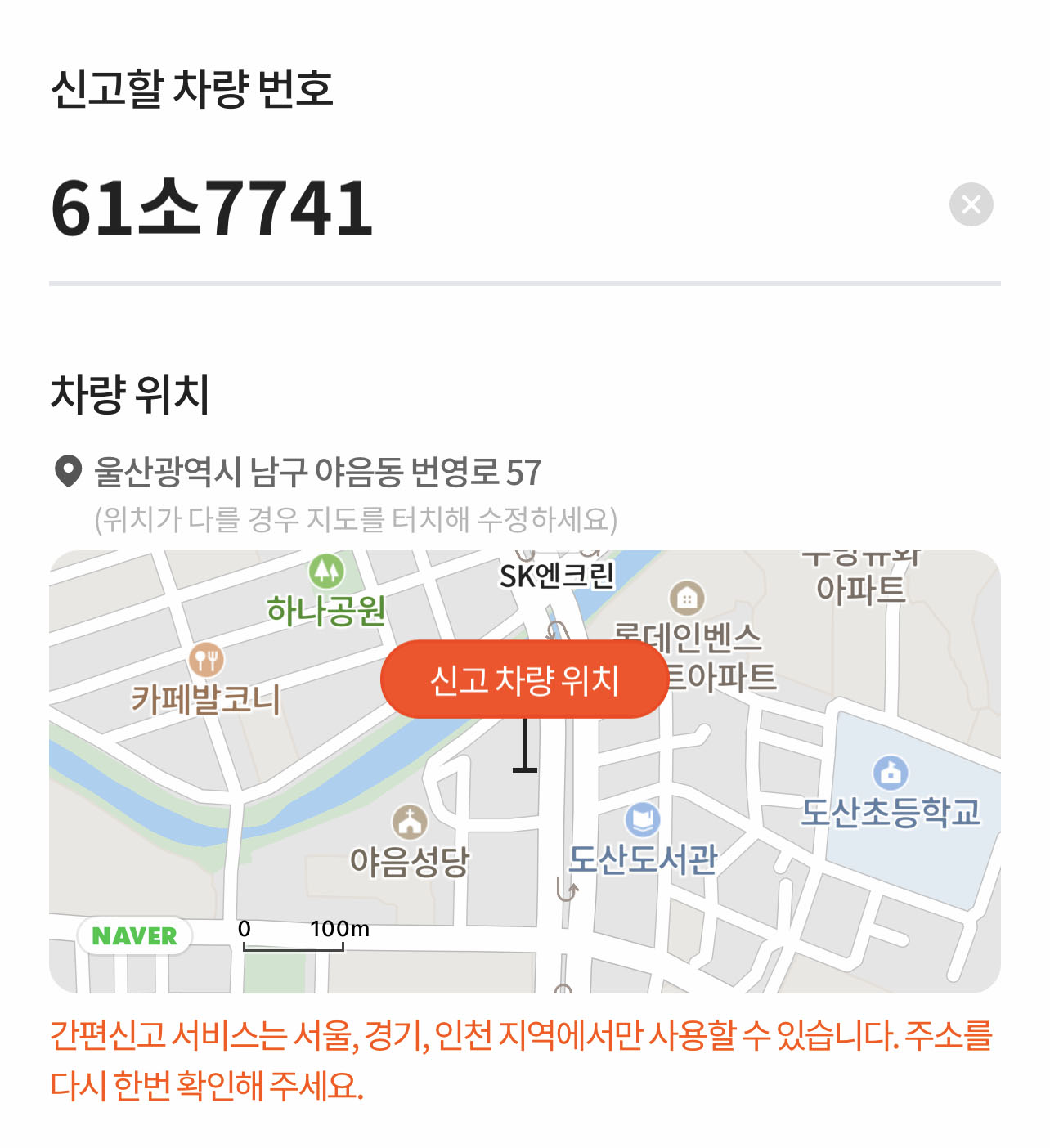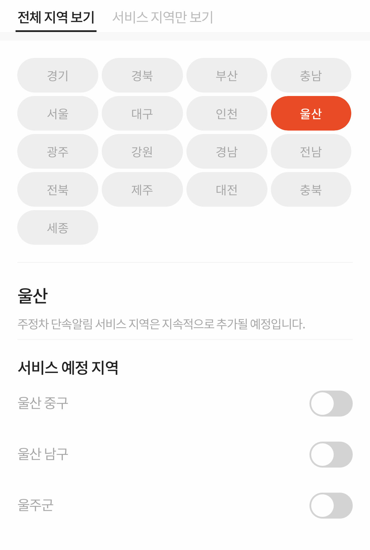 보시다시피 부산인 경우 주정차 알림이 가능하지만 울산인 경우 한곳도 안됩니다.