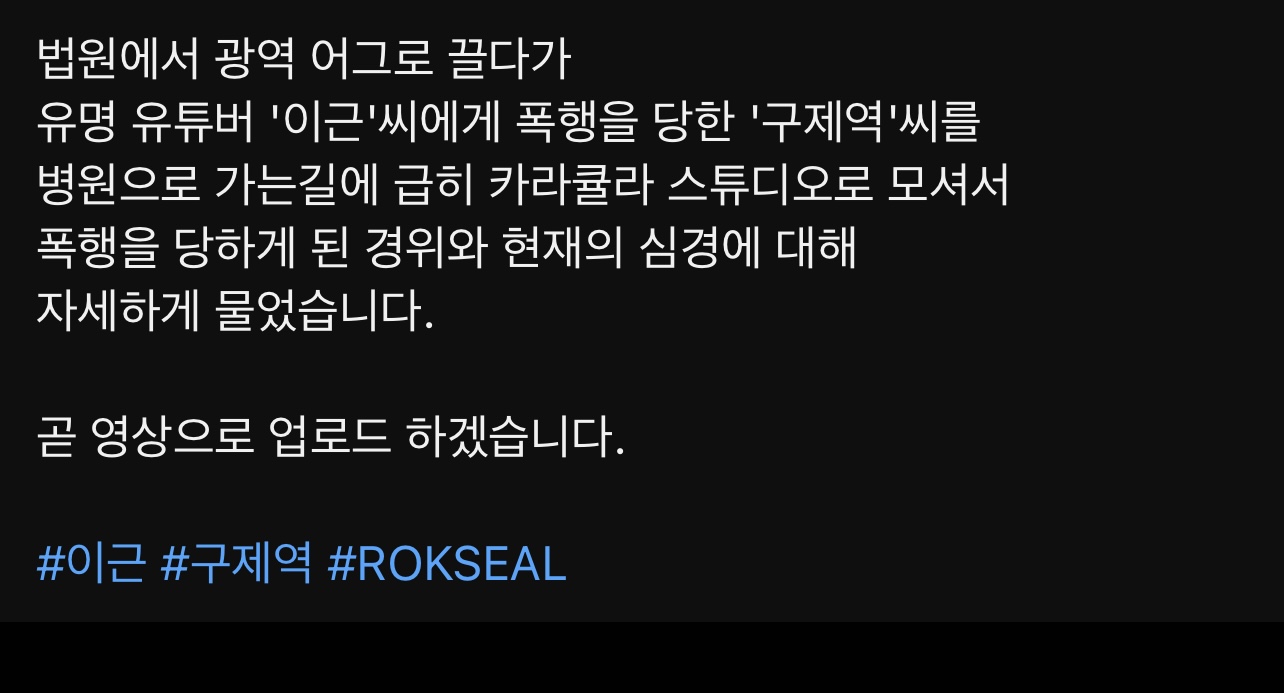이근(39) 전 대위가 재판 직후 방청 온 유튜버 구제역을 폭행 했습니다.