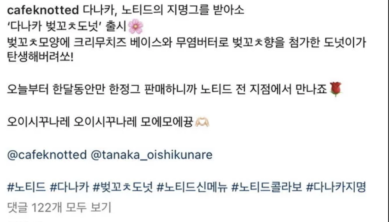 노티드 공식 인스타그램 계정에 다나카의 사진과 함께 벚꽃 도넛을 홍보하는 게시물이 올라왔는데