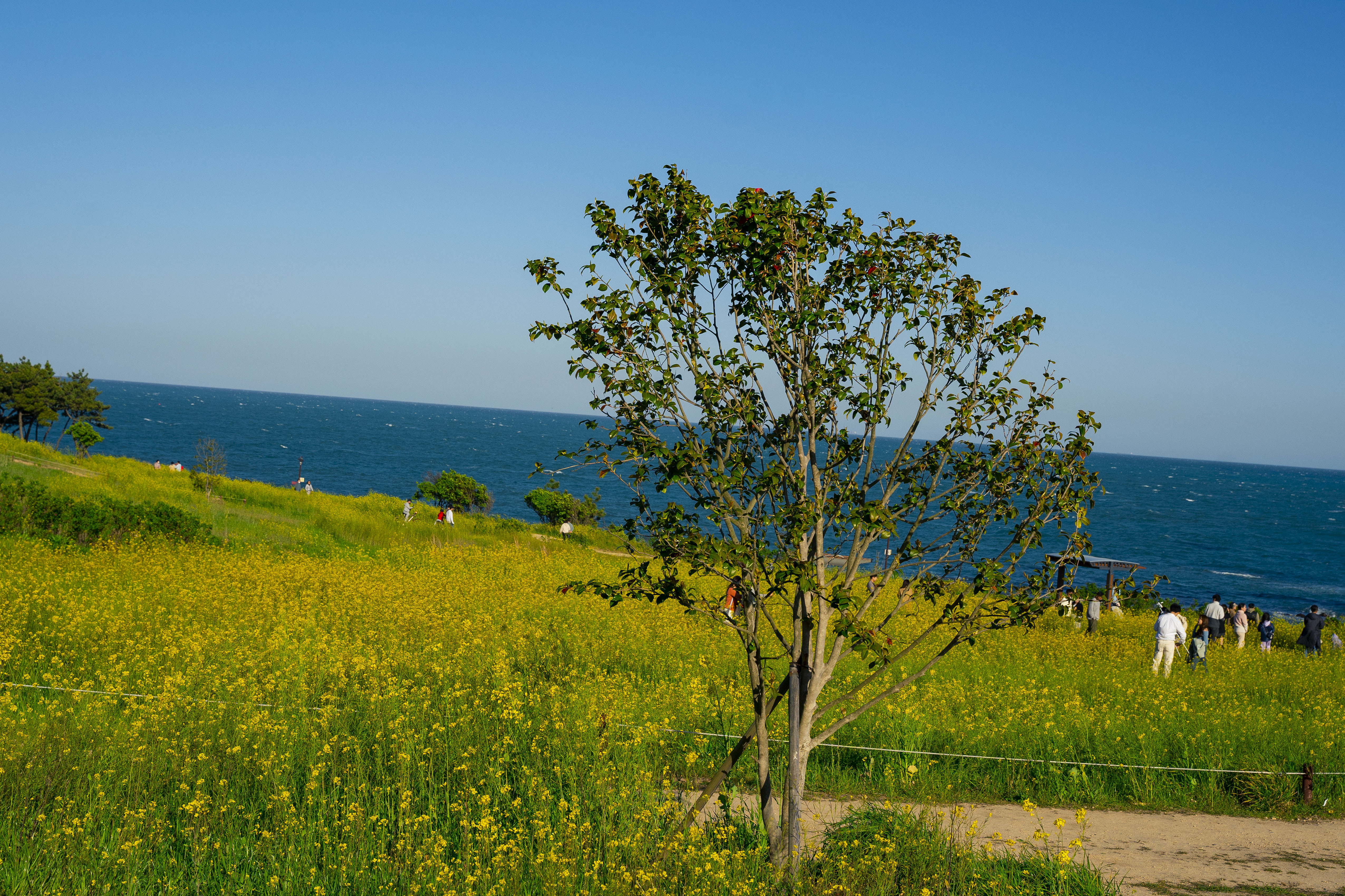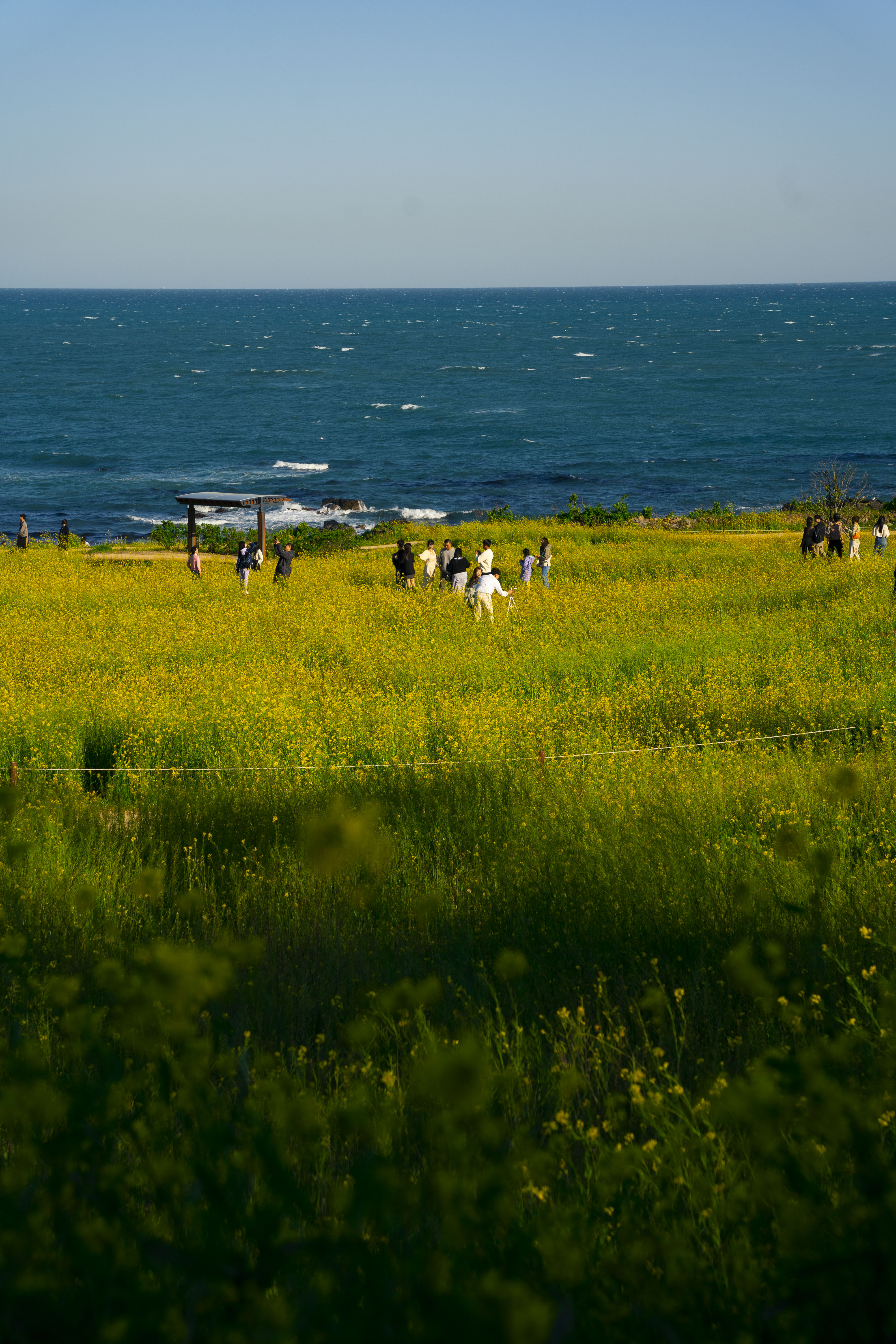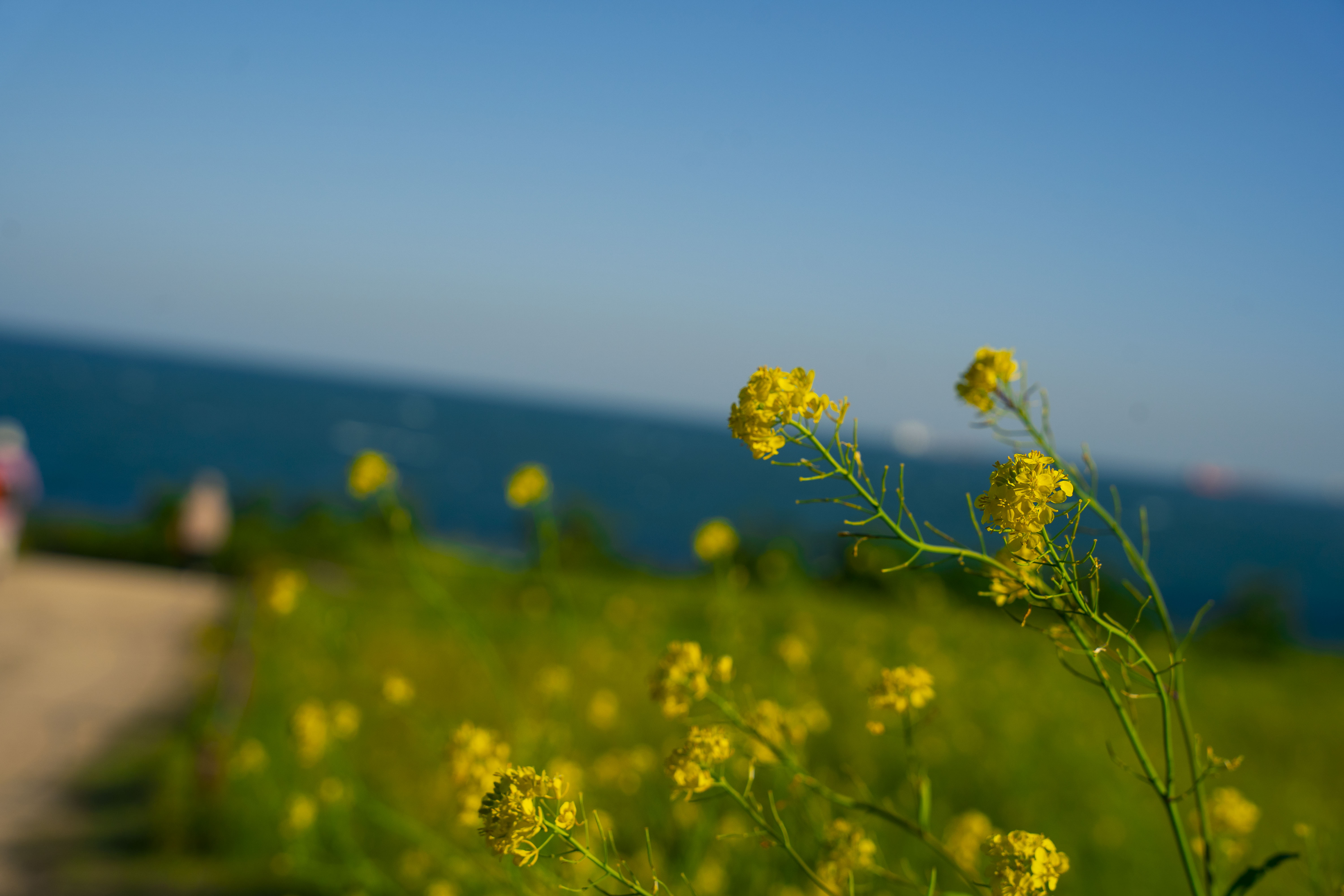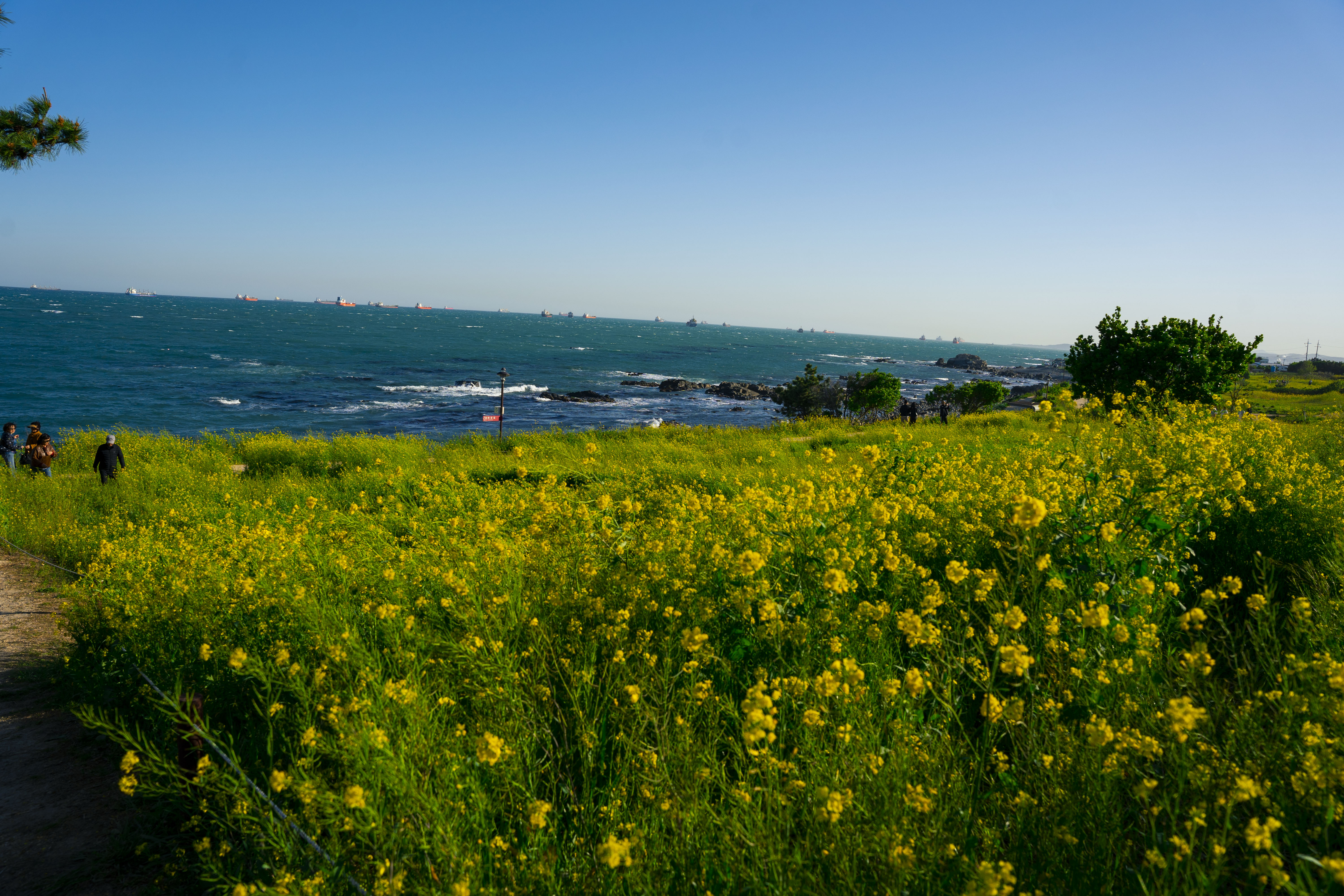 유채꽃은 바다 위에 피어나며 파란 하늘과 잘 어울리는 색상이죠.