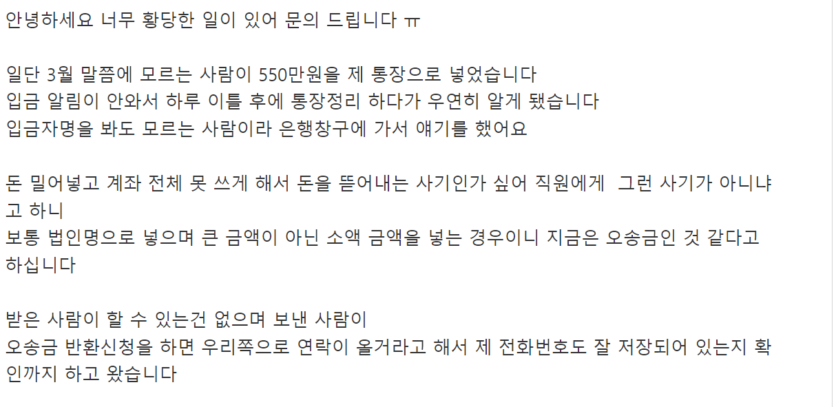2. 은행창구에서 얘기해보니, 큰 금액이 아닌 소액 금액을 넣는 경우로 보면, 오송금일 가능성이 크다고 함