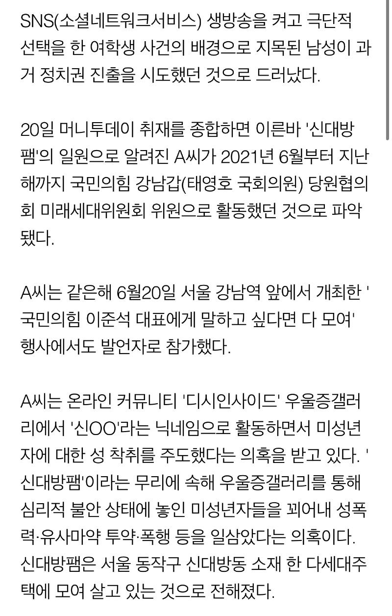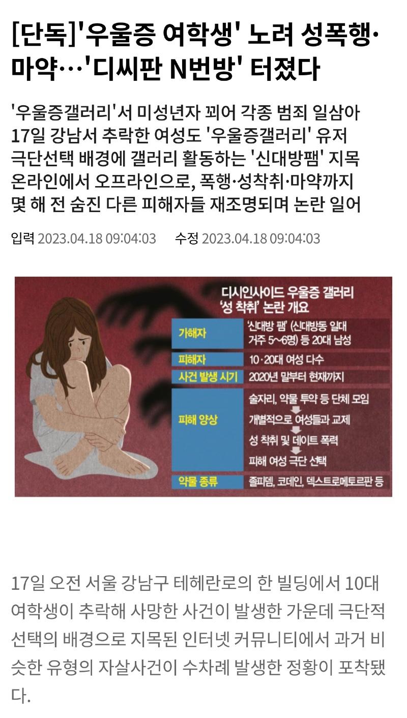 10대 여학생 A양이 SNS 라이브 방송을 킨 채 투신한 사건이 발생했습니다. 이번 사건은 디시인사이드 '우울증 갤러리'에서 극단적 선택을 논의한 뒤 실행에 옮긴 것으로 밝혀졌습니다. 최근 이 커
