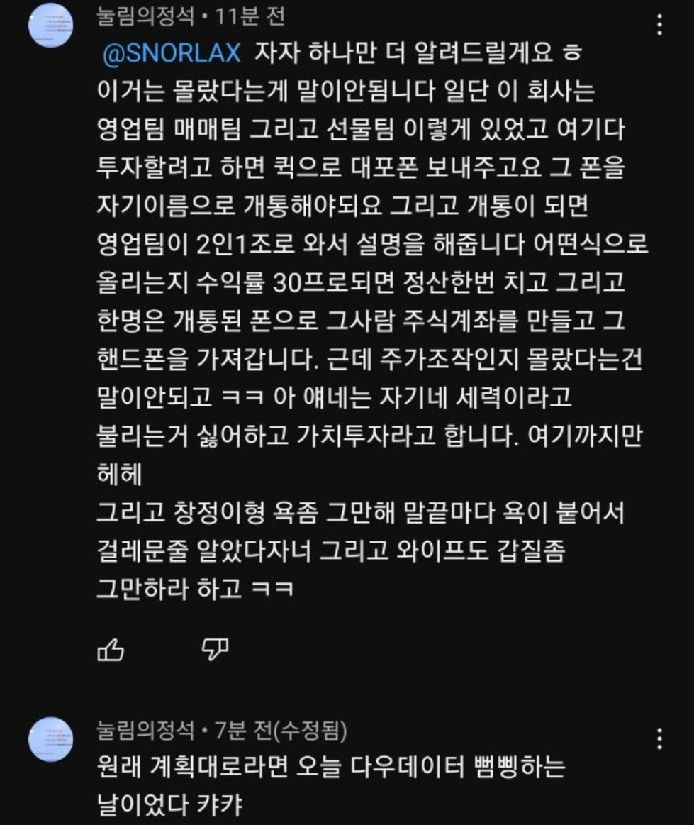 처음에는 종목 설명도 열심히 하고 공부도 시키며, 투자를 은근슬쩍 시키다가 신뢰를 얻으면 필요한 주식을 노골적으로 소개합니다. 그때 신뢰를 얻어서 무슨 주식인지 몰라도 "그 사람이면 믿을 만 하지"라며 투자하게 되고, 금액도 커집니다.