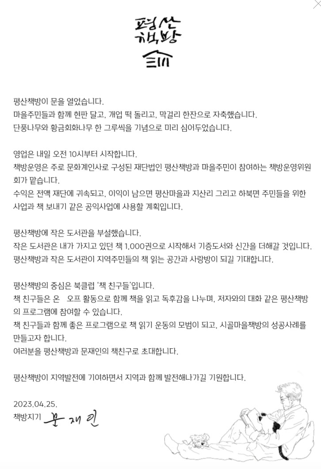문재인 전 대통령이 퇴임 후 경남 양산에 내려가 살면서, 최근 시골 마을에 '평산책방'을 열었습니다. 문 전 대통령은 이 책방이 지역의 명소가 되기를 기대한다고 밝혔습니다.