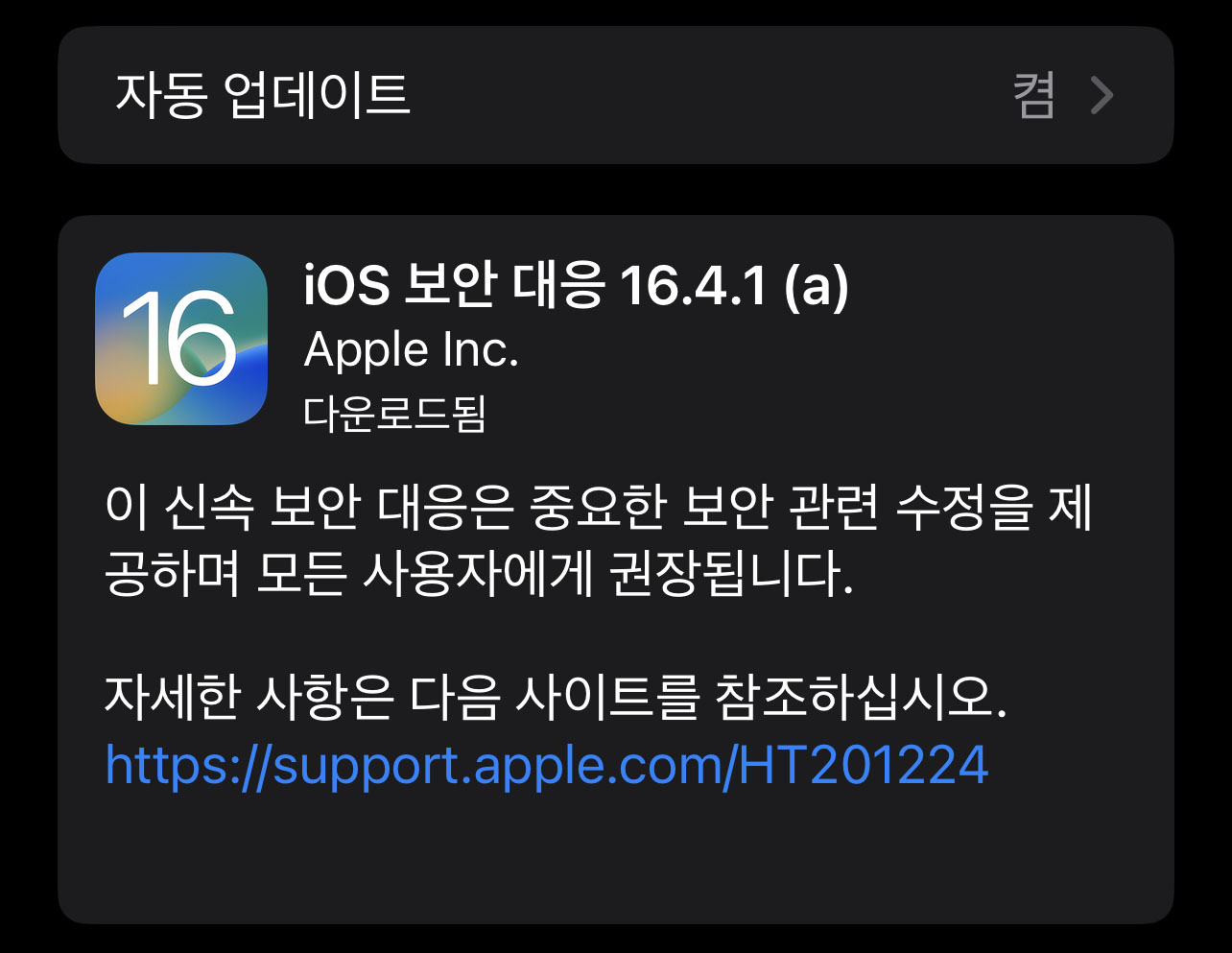 얼마전 iOS 보안 대응 16.4.1(a) 업데이트가 있었습니다.