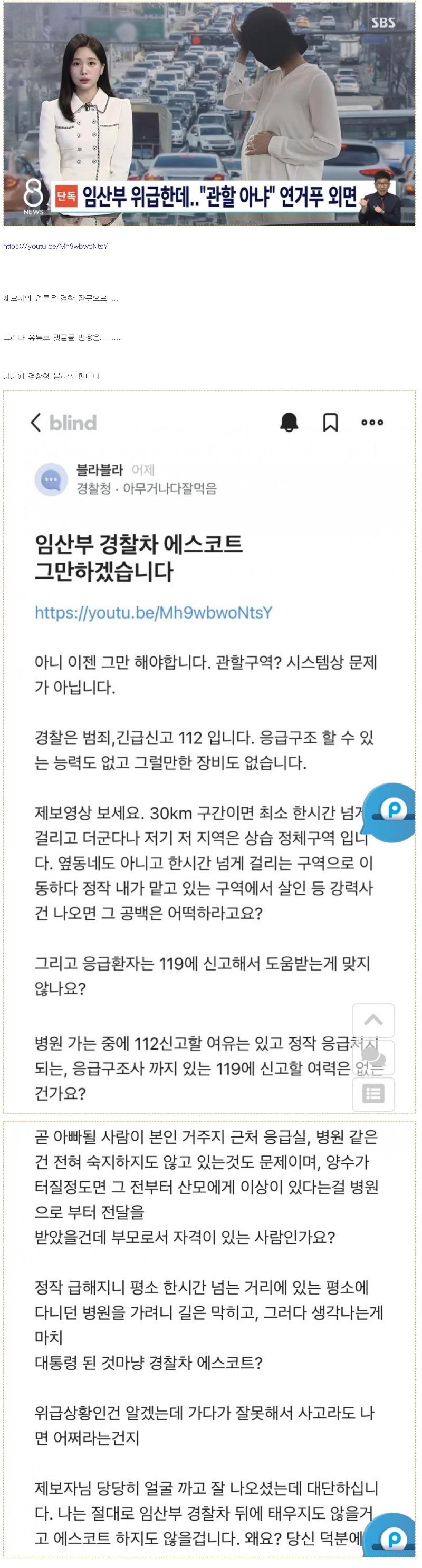 22일, 직장인 온라인 익명 커뮤니티 ‘블라인드’에 경찰에 근무하는 A씨는 "(임산부 에스코트) 이젠 그만해야 한다. 관할구역·시스템상 문제가 아니다. 경찰은 범죄·긴급신고 112다. 응급구조 할 수 있는 능력도 없고 그럴만한 장비도 없다"고 글을 올렸습니다.