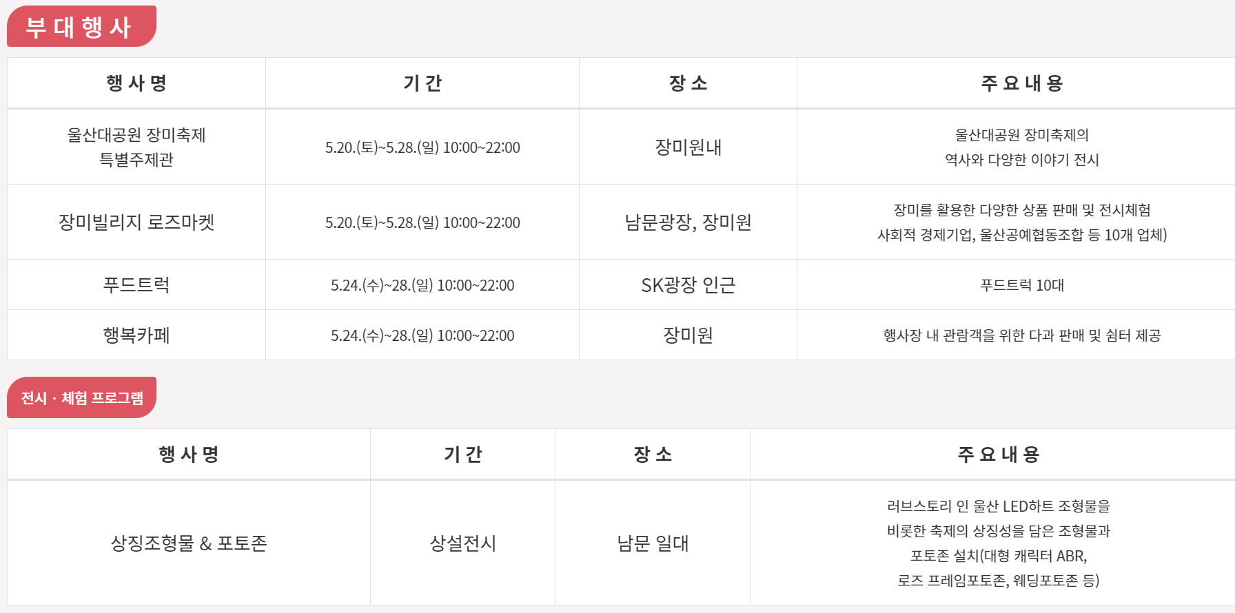 📆 이번 축제는 2023년 5월 24일부터 28일까지, 총 5일 동안 울산 남구에 위치한 울산대공원 장미원에서 열립니다.
