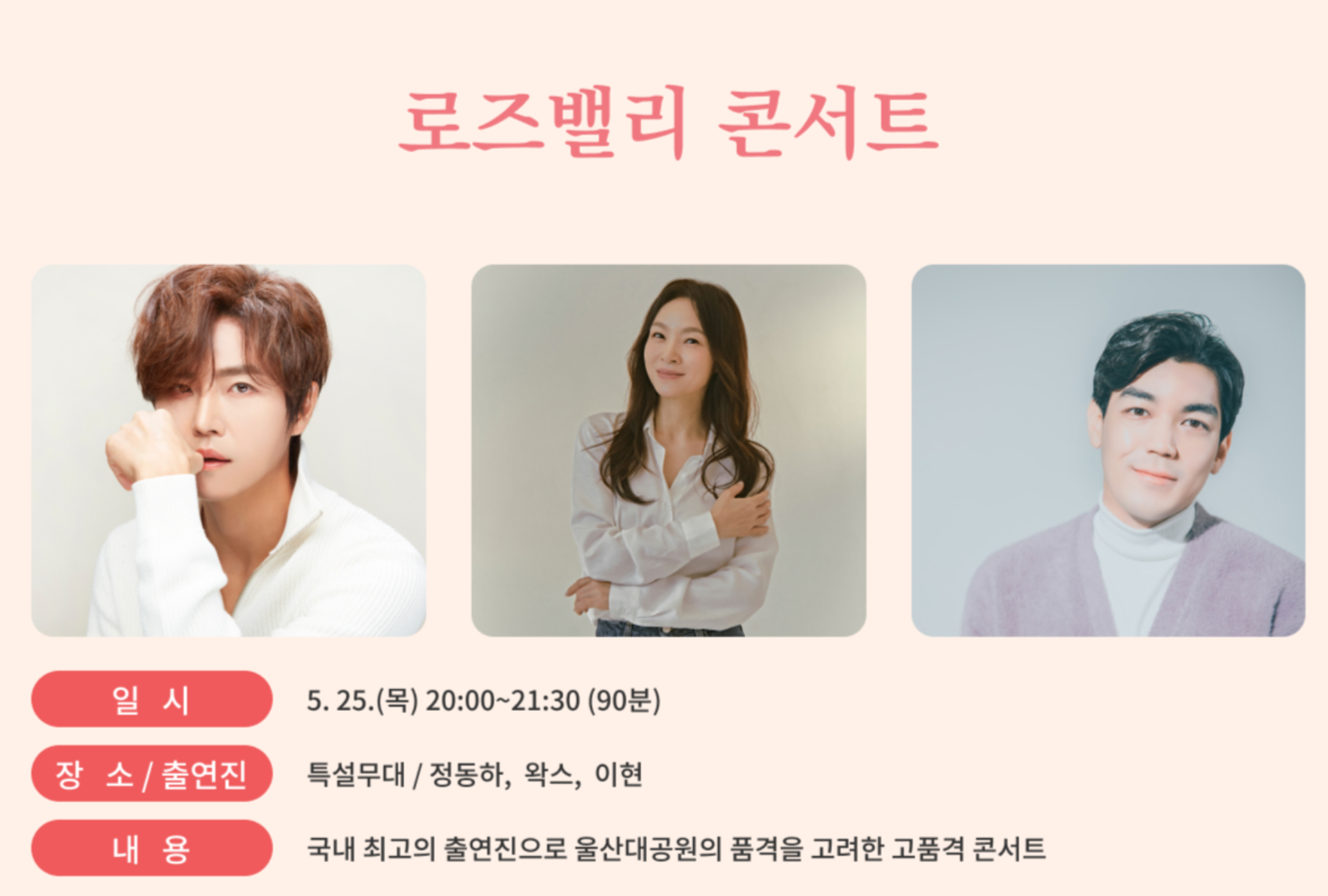 정동하, 왁스, 이현등이 출연하는 로즈밸리 콘서트가 준비되어 있습니다.