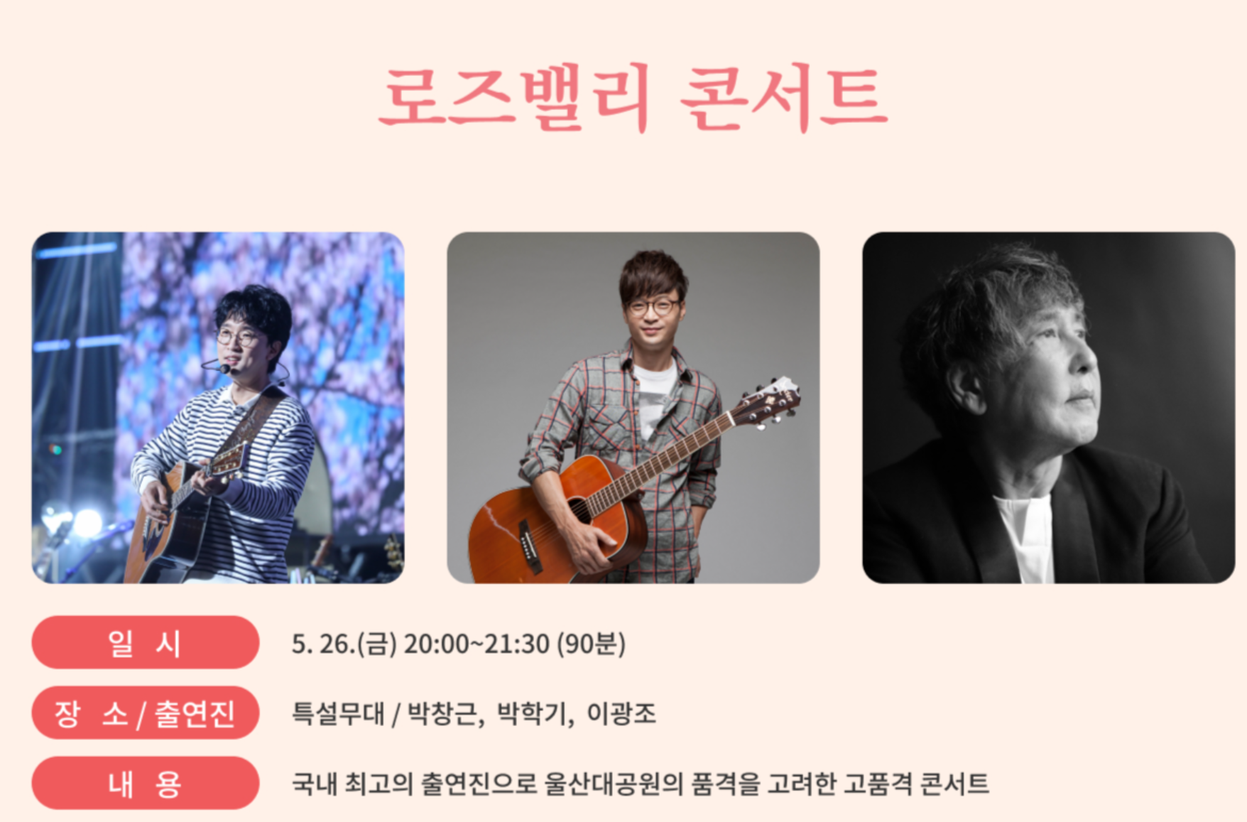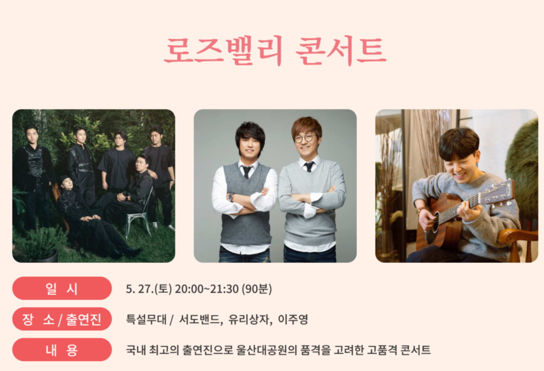 그밖에도 러브뮤직콘서트, 행복스튜디오, 전국로즈관악제, 게릴라 거리 퍼포먼스, 로즈토크콘서트등 다양한 행사가 준비되어 있으니 이번 주말까지 울산대공원 장미축제를 즐겨보세요~