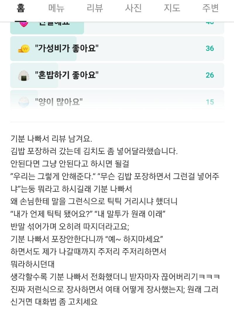 이후, 이 시민은 해당 김밥집의 네이버 후기를 확인해 보았고, 그곳에는 충격적으로도 그 여성이 편향된 리뷰를 남겨 놓았다는 사실을 알게 되었습니다.