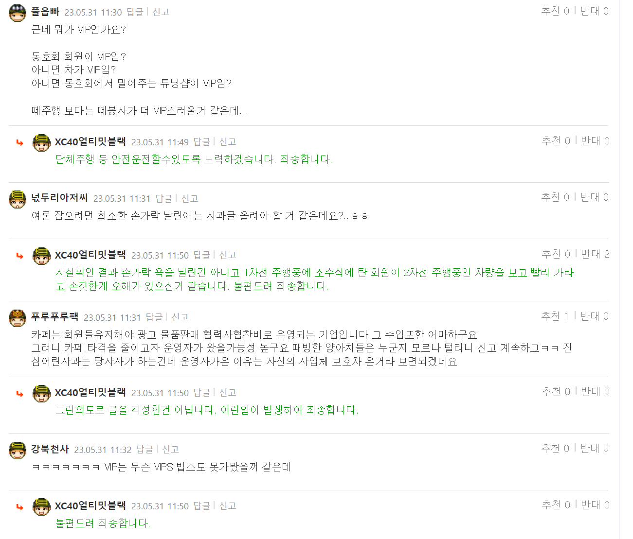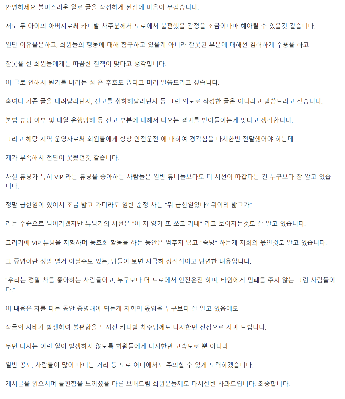 동호회 회원들의 불법 행위에 대한 목격자의 신고를 받고, VIP 튜닝 동호회 관리자가 사과문을 발표했습니다. 관리자는 두 아이의 아버지로서 이번 사태에 대한 불편함을 이해하며, 회원들의 잘못된 행동에 대해 사과하고 반성하였습니다. 그는 그들의 행동에 대해 수용하고, 행동에 대한 따끔한 질책이 필요하다는 점을 인정하였습니다.