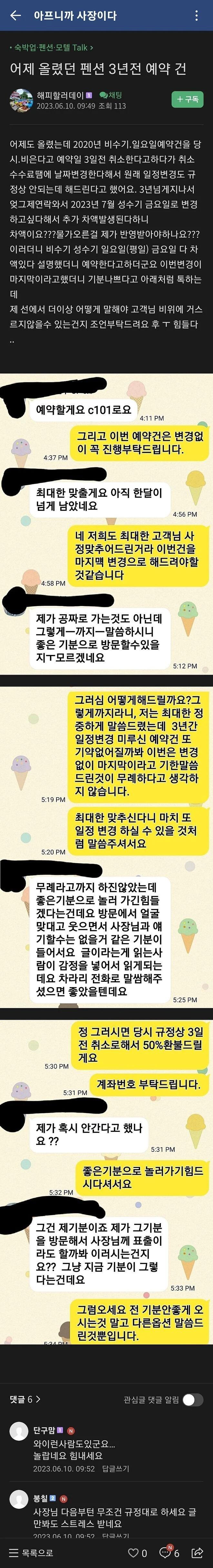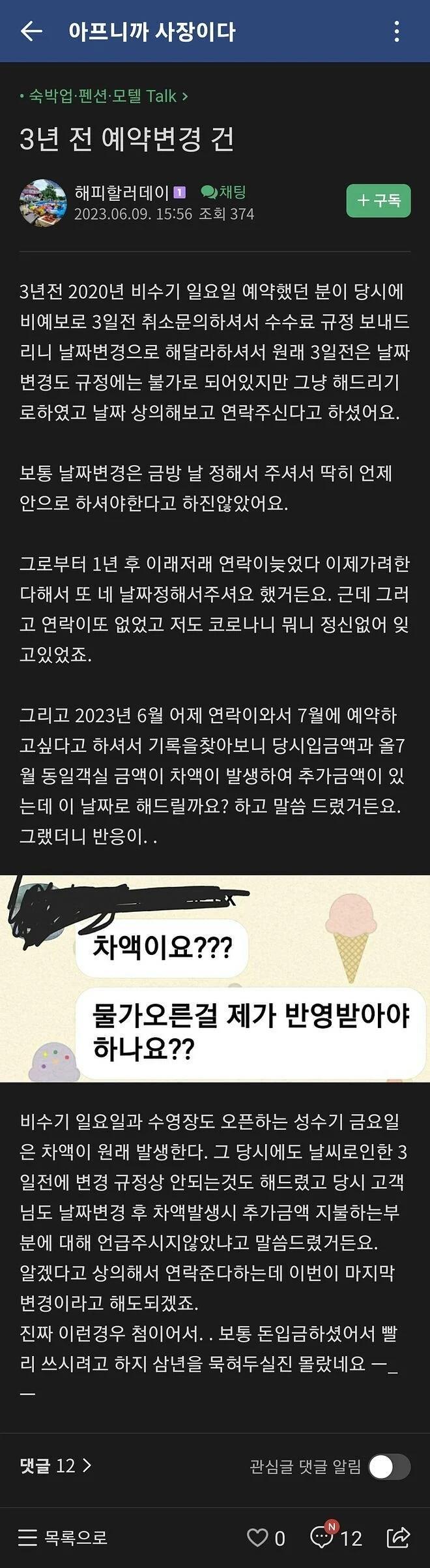 하지만, 2023년 6월, 고객이 다시 연락을 해왔다. 이번에는 7월에 예약하고 싶다고 했다. 2020년 당시 예약한 방과 2023년 7월 예약하려는 방의 가격 차이로 인해 추가 금액이 발생했다. 이에 대해 고객에게 이야기하니 고객은 "물가 오른 걸 제가 반영 받아야 하나요?"라고 반응했다.