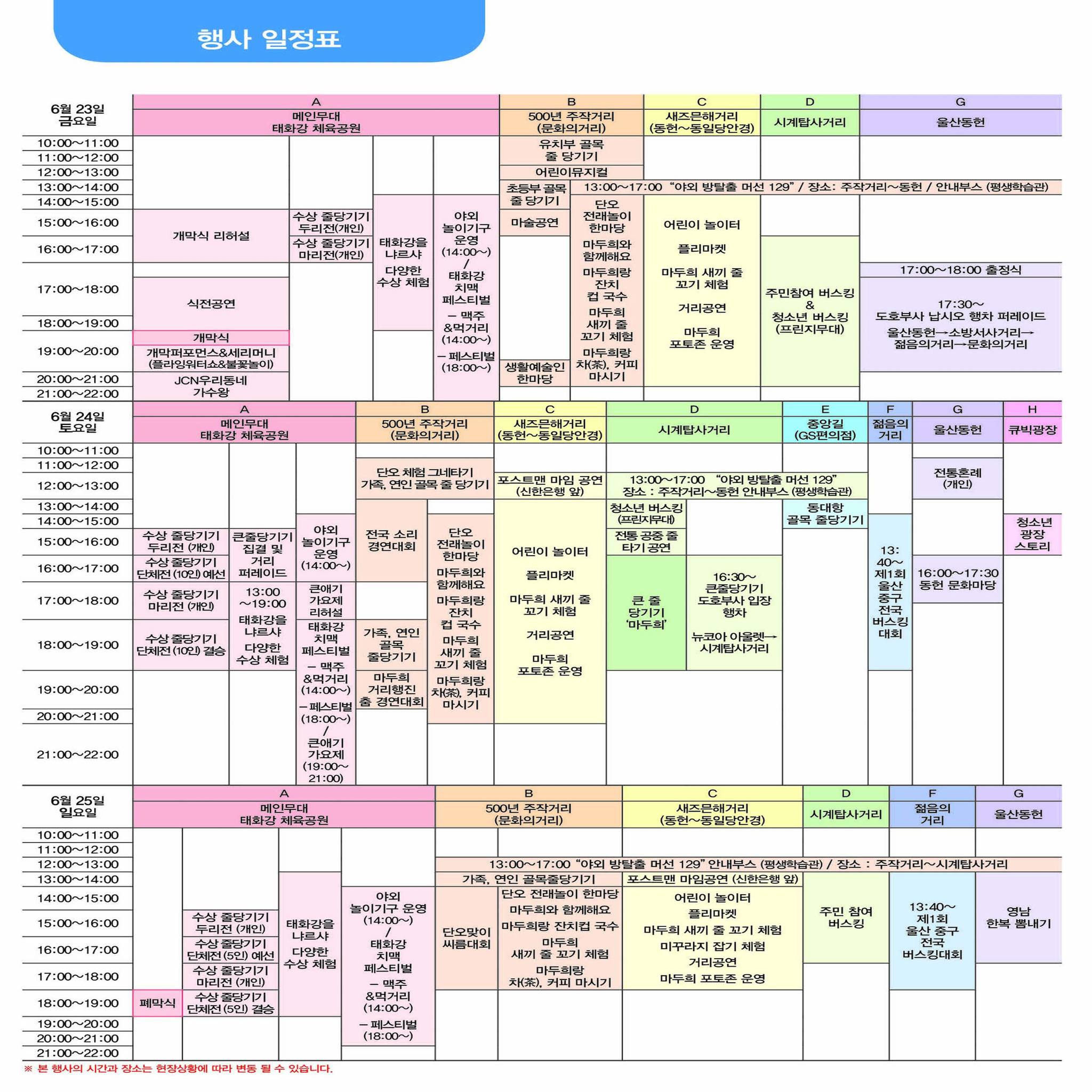 축제의 프로그램도 정말 다양해졌는데 원도심 일대에서는 마두희 큰 줄당기기, 단오 씨름대회, 강변 그네타기, 울산큰애기 가요제, 마두희 춤 경연대회, 벼룩시장 등 다양한 행사가 진행될 예정이며 전국소리경연대회, 영남한복 뽐내기, 울산동헌 문화마당 등도 계획되어 있습니다.