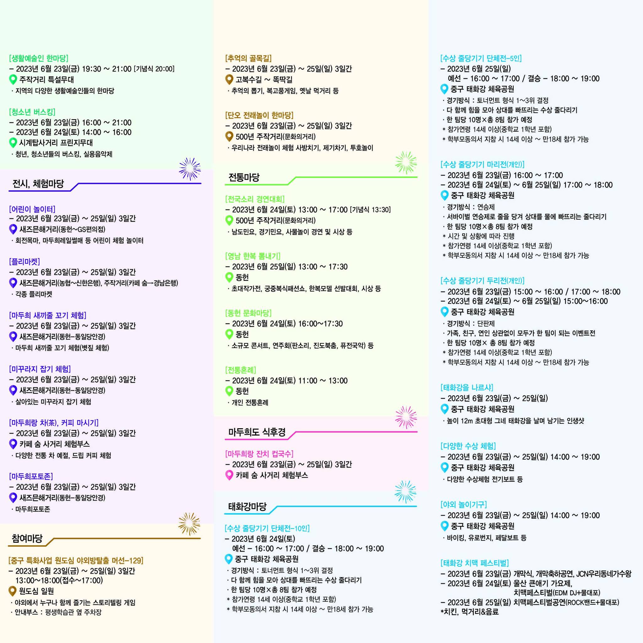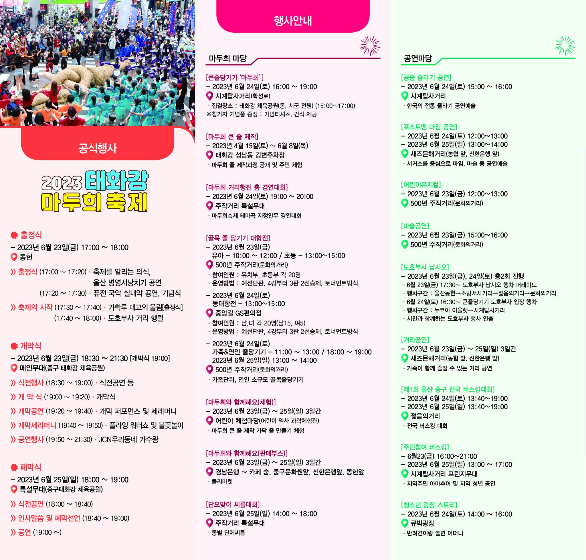 태화강마두희축제, 모든 이벤트와 즐거움이 태화강에 이어졌습니다. 이번 2023년에는 평소와는 다르게 울산 중구와 울산시가 함께 이 화려한 축제를 후원하며, '함께하면 커지는 힘! 태화강에 잇다!'라는 슬로건 아래 기대 이상의 재미를 선사했습니다.