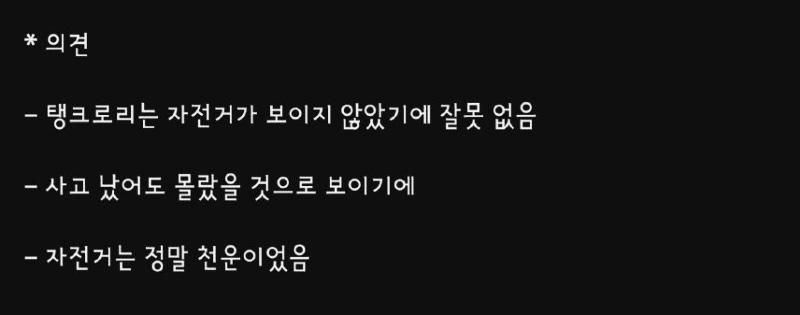 A씨는 오전 근무를 마치고 집으로 돌아가던 중 주유소에 들러 기름을 넣기 위해 자가용을 우회전 대기 중이었다고 합니다. 이때, 앞에서 달려오던 자전거가 차량을 추월하려다가 트럭과 부딪히는 사고를 목격하게 되었습니다. 충격적인 것은 이 자전거 사고를 뱅크로리 운전자가 전혀 인지하지 못하고 계속 달려가던 것이었다고 말합니다.
