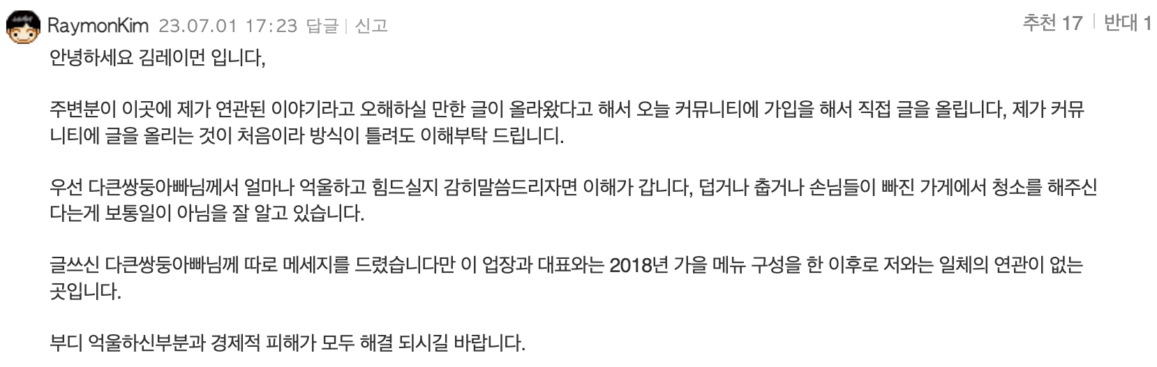 해당 카페는 김레이먼의 카페로 알려지기 시작하며 김레이먼도 이 사실을 알게 되며 댓글을 남겼습니다.