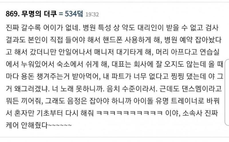 또 신입 걸그룹이 핸드폰도 사용하게 해, 매니저 대기타게 해, 연습도 똑바로 안해, 대표는 용돈도 챙겨줘, 음치수준이라 트레이너도 부쳐줘