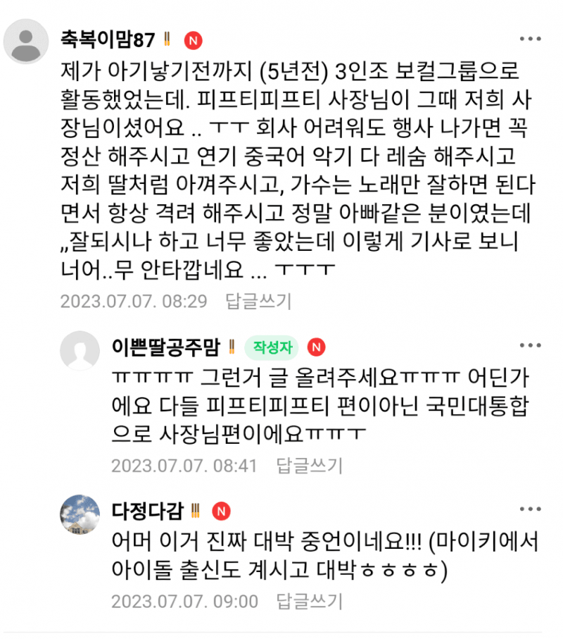 "활동 하는 당시 회사가 어려워도 행사 나가면 꼭 정산해주시고 연기, 중국어, 악기, 다 레슨 해주셨습니다''저희 딸처럼 아껴주시고 가수는 노래만 잘하면 된다면서 항상 격려 해주시고 아빠같은 분..."