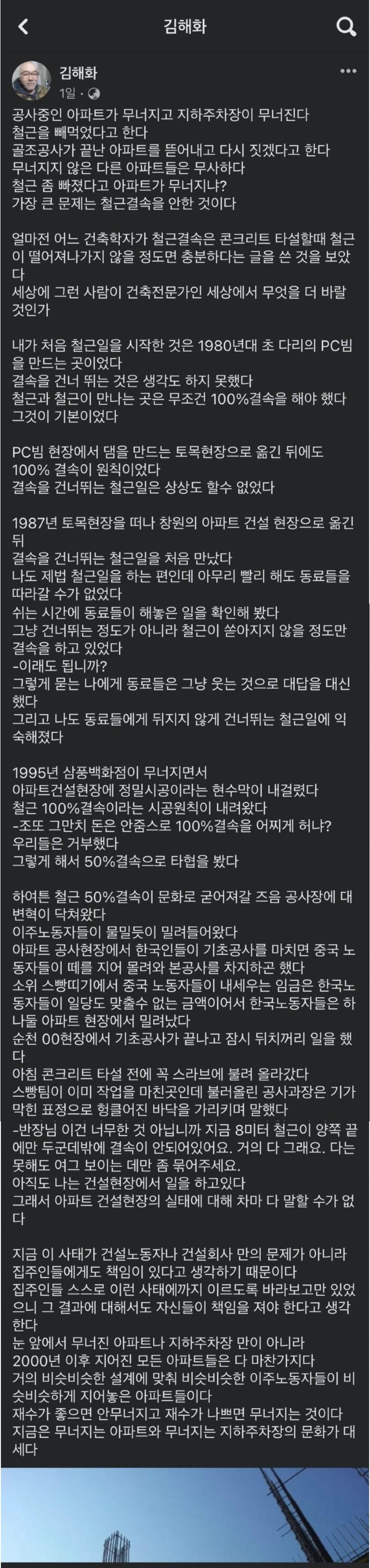 1995년 삼풍백화점 붕괴 사건 이후 '철근 100% 결속'이라는 원칙이 내려왔지만, 노동자들은 이를 거부했다. 이후에는 50% 결속으로 타협을 보았다. 그런데 이후에 이주 노동자들이 대량으로 건설 현장에 들어오며 상황이 급변했다.